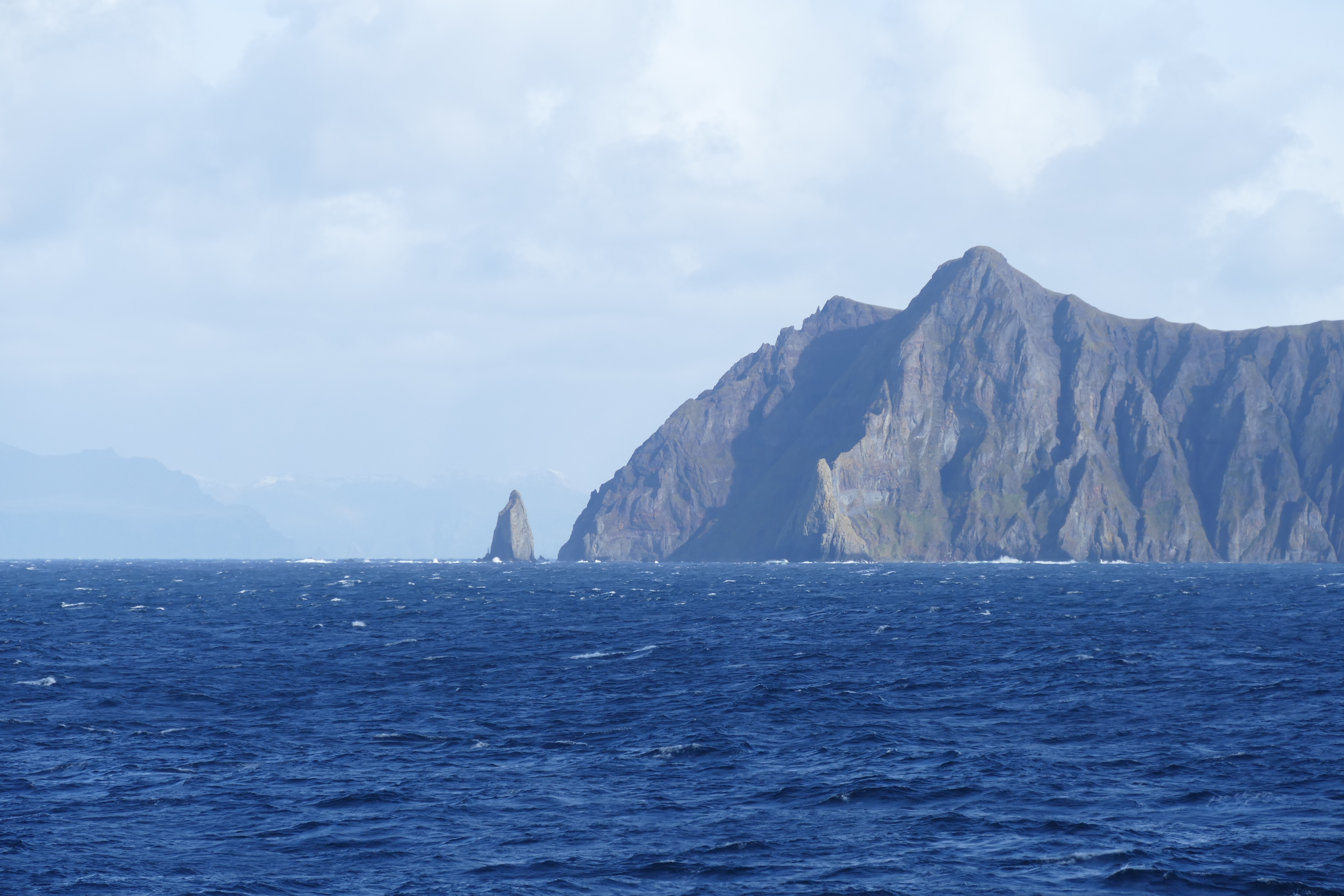 The entrance to Dutch Harbor is marked by rugged sea cliffs and the iconic Priest Rock. Aboard the USCGC Healy near Dutch Harbor, Alaska. 53.90°, -166.53°.