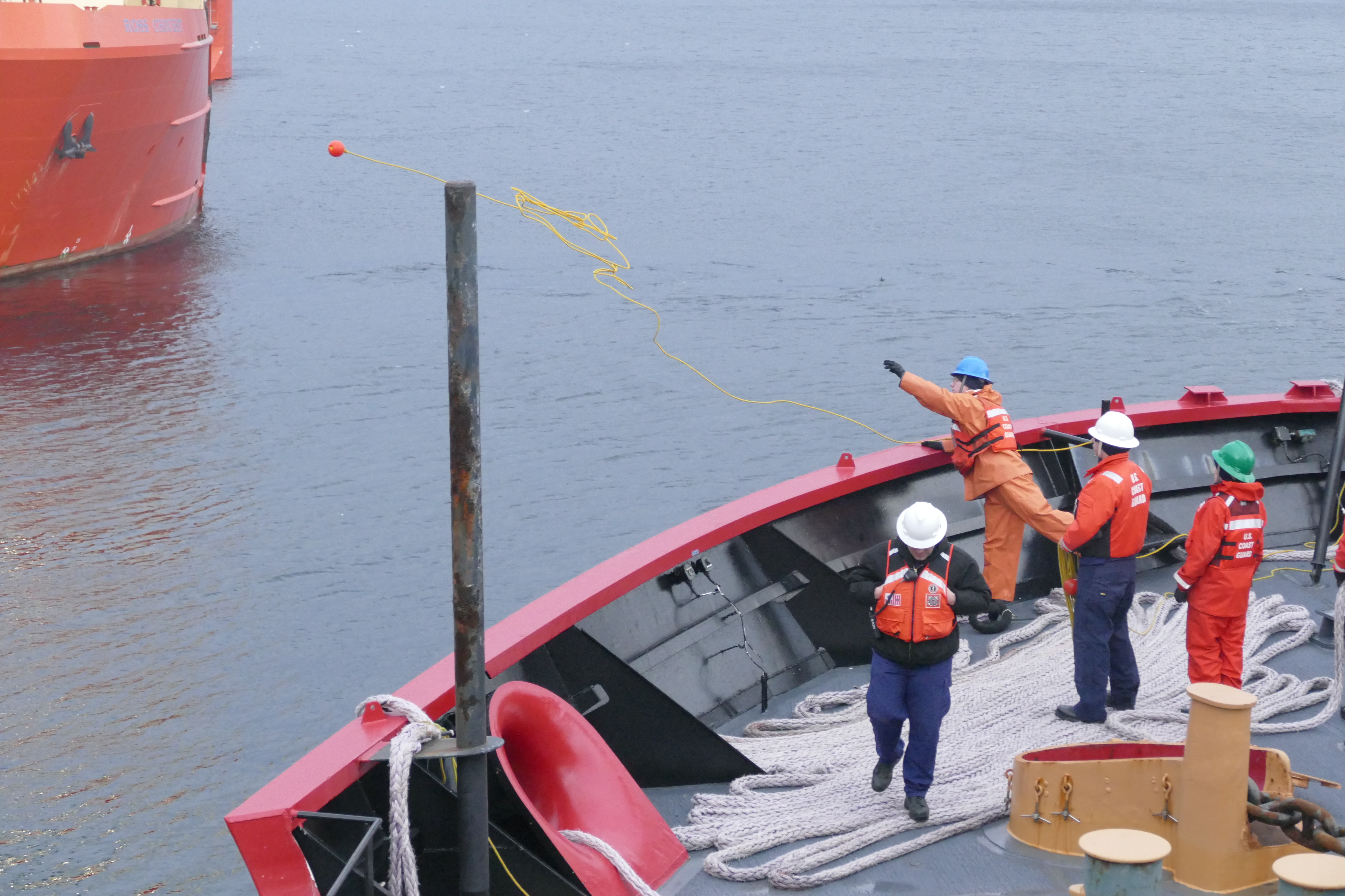 A messenger line is tossed to the pier and used to pull over the mooring line to tie up the Healy. Aboard the USCGC Healy at Dutch Harbor, Alaska. 53.90°, -166.53°.