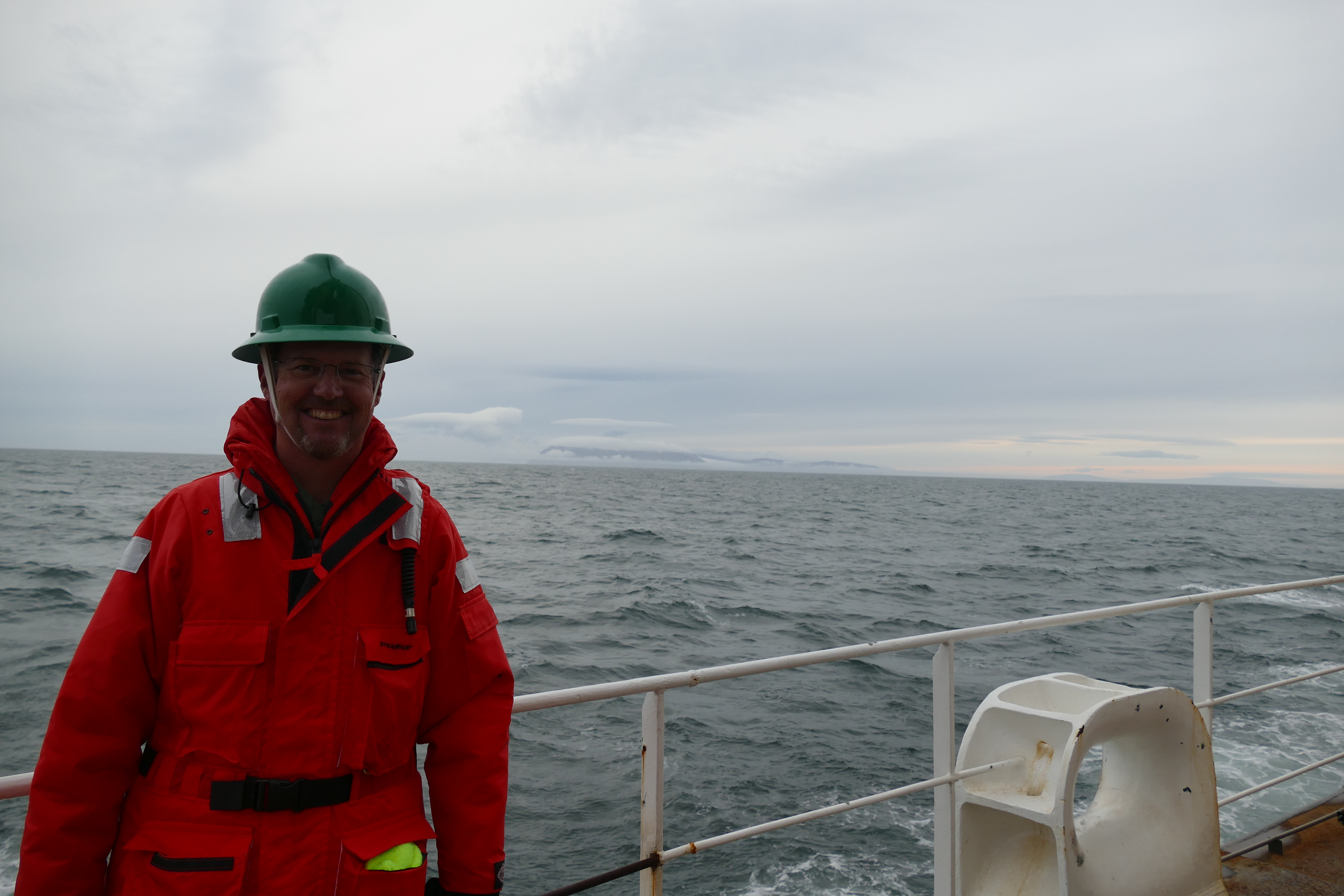 Bill Schmoker poses with the Diomede Islands in the background. Aboard the USCGC Healy in the Bering Sea. 64.045°, -166.944°.