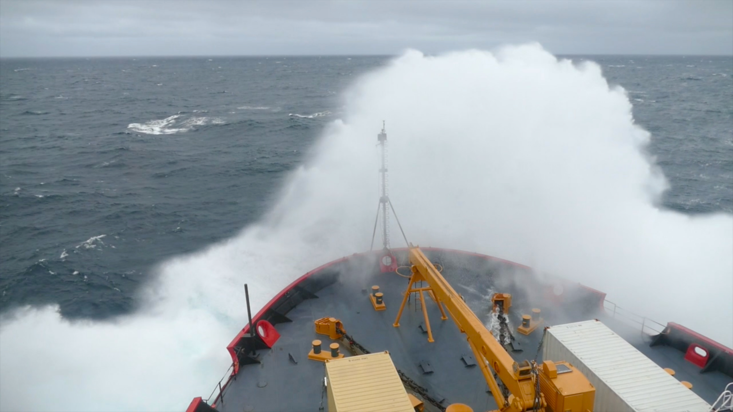 The USCGC Healy plunges through a wave as it pushes north through the Chukchi Sea. Aboard the USCGC Healy in the Chukchi Sea. 71.01°, -167.74°.