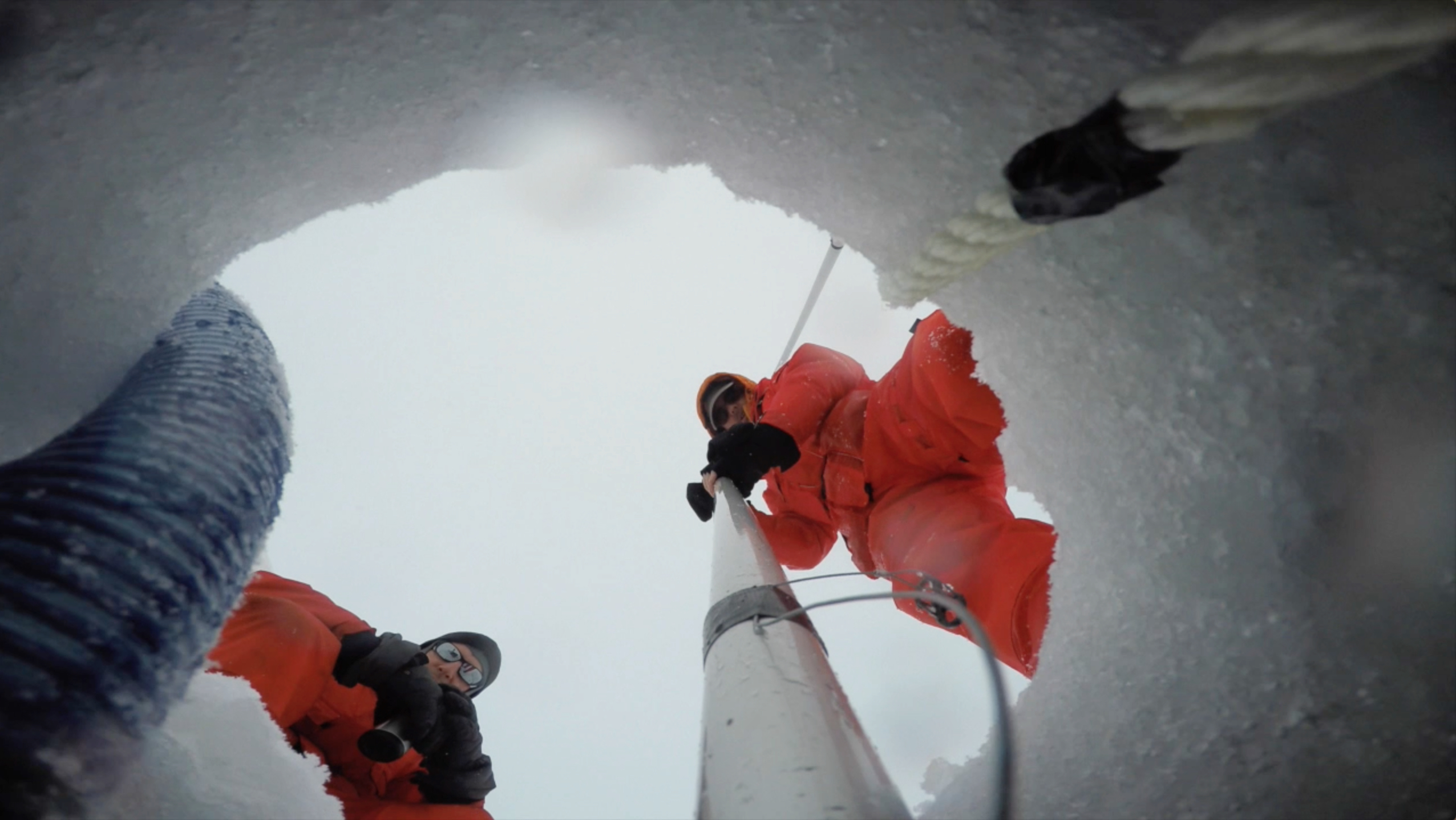 Mark Stephens watches as Bill Schmoker lowers a GoPro camera (attached to an aluminium pole) through the sea ice at a beryllium-pumping station. Near the USCGC Healy in the Makarov Basin in the Arctic Ocean. 86.70°, -149.48°.