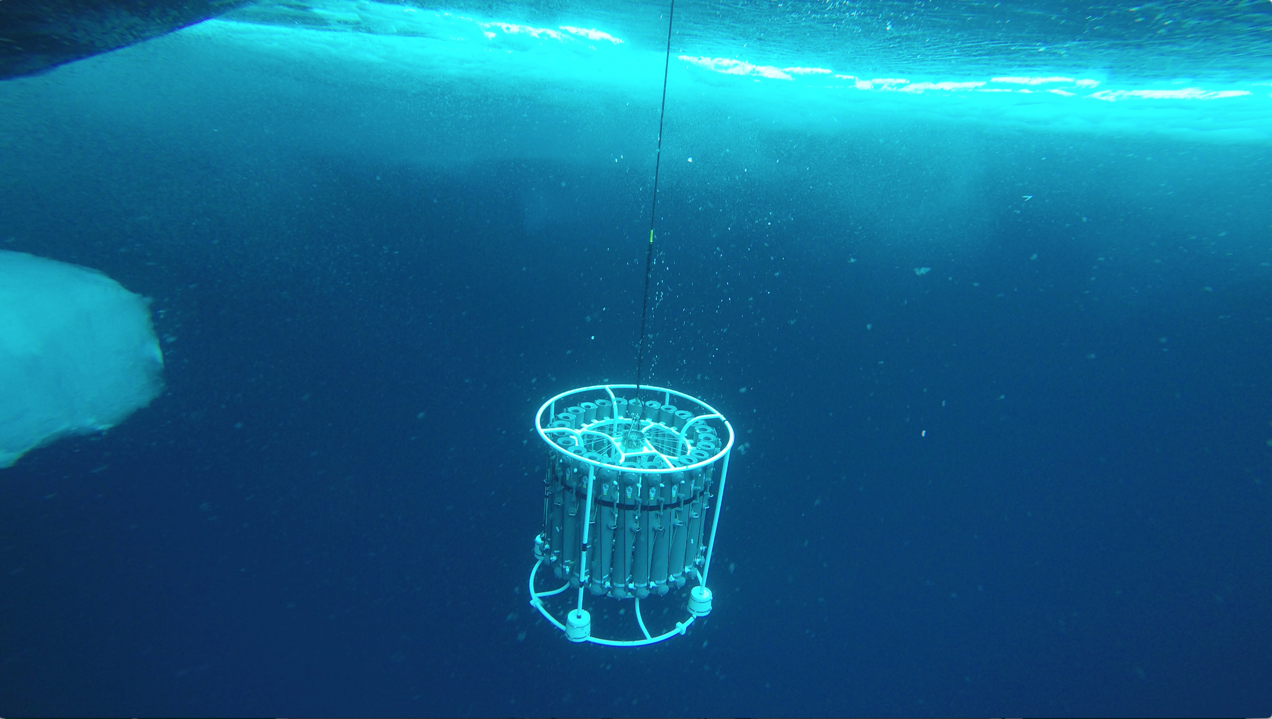 A seal’s-eye view of a GEOTRACES CTD (conductivity, temperature, and depth instrument) cast. The Healy is in a newly-frozen lead with just an inch or two of ice. There is thicker sea ice in the background. Near the USCGC Healy in the north Canada Basin. 82.49°, -149.83°.