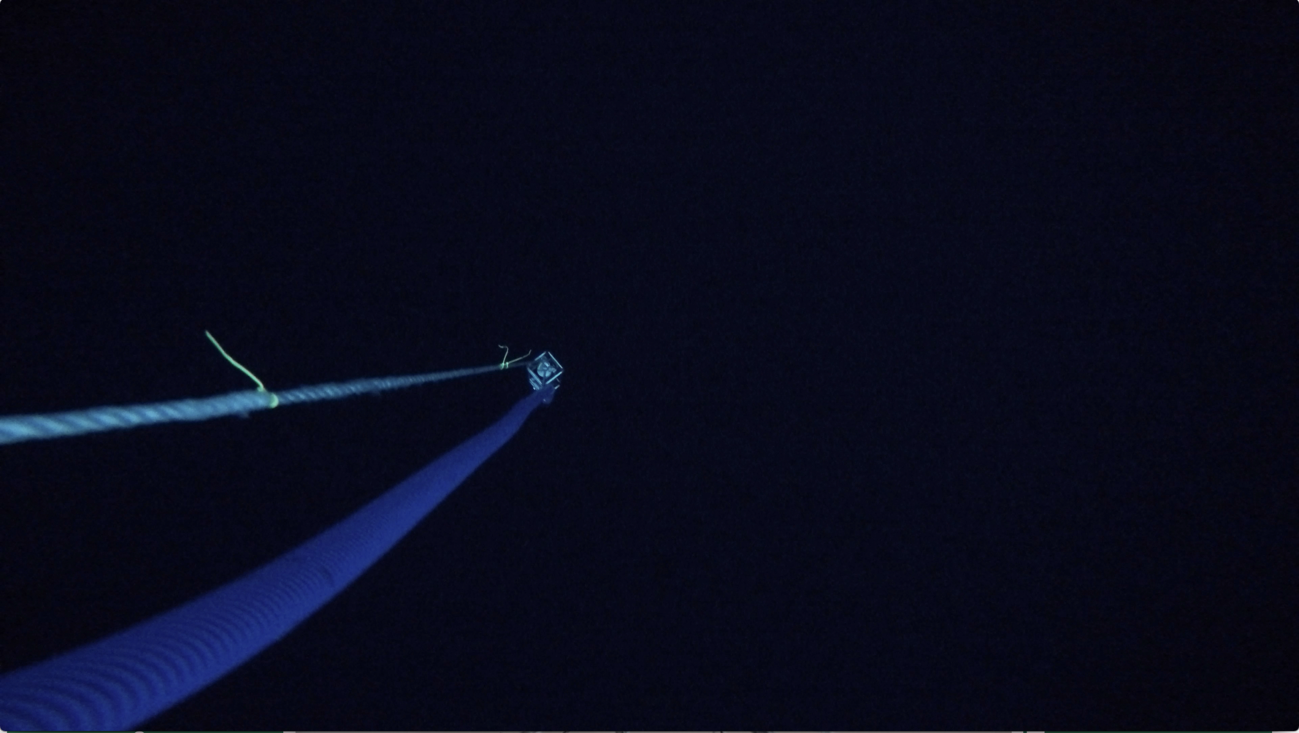 A view looking down from under the sea ice, the Arctic ocean water looks black, with a metallic cage holding a CTD (conductivity, temperature, and depth instrument) and a blue hose for pumping water back to the surface held at the proper depth by the braided line. Near the USCGC Healy in the north Canada Basin. 82.49°, -149.83°.