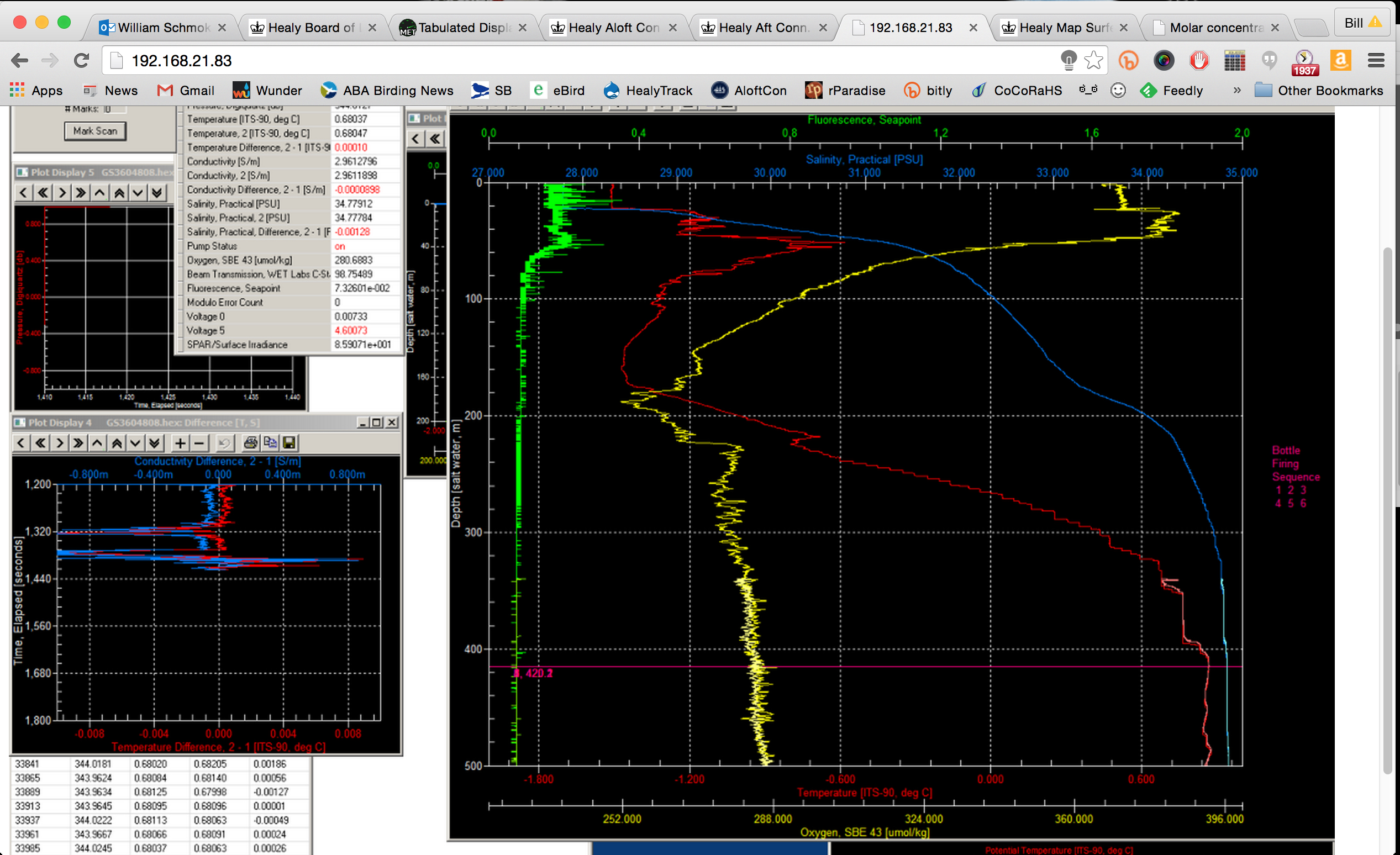 During a CTD (conductivity, temperature, and depth instrument) cast a summary screen can be accessed via the ship’s network. The main graph shows salinity (blue), temperature (red), dissolved oxygen (yellow), and chloropyll fluorescence (green), along with depth (on this cast, to 500m). Aboard the USCGC Healy in the north Canada Basin. 80.42°, -149.51°.