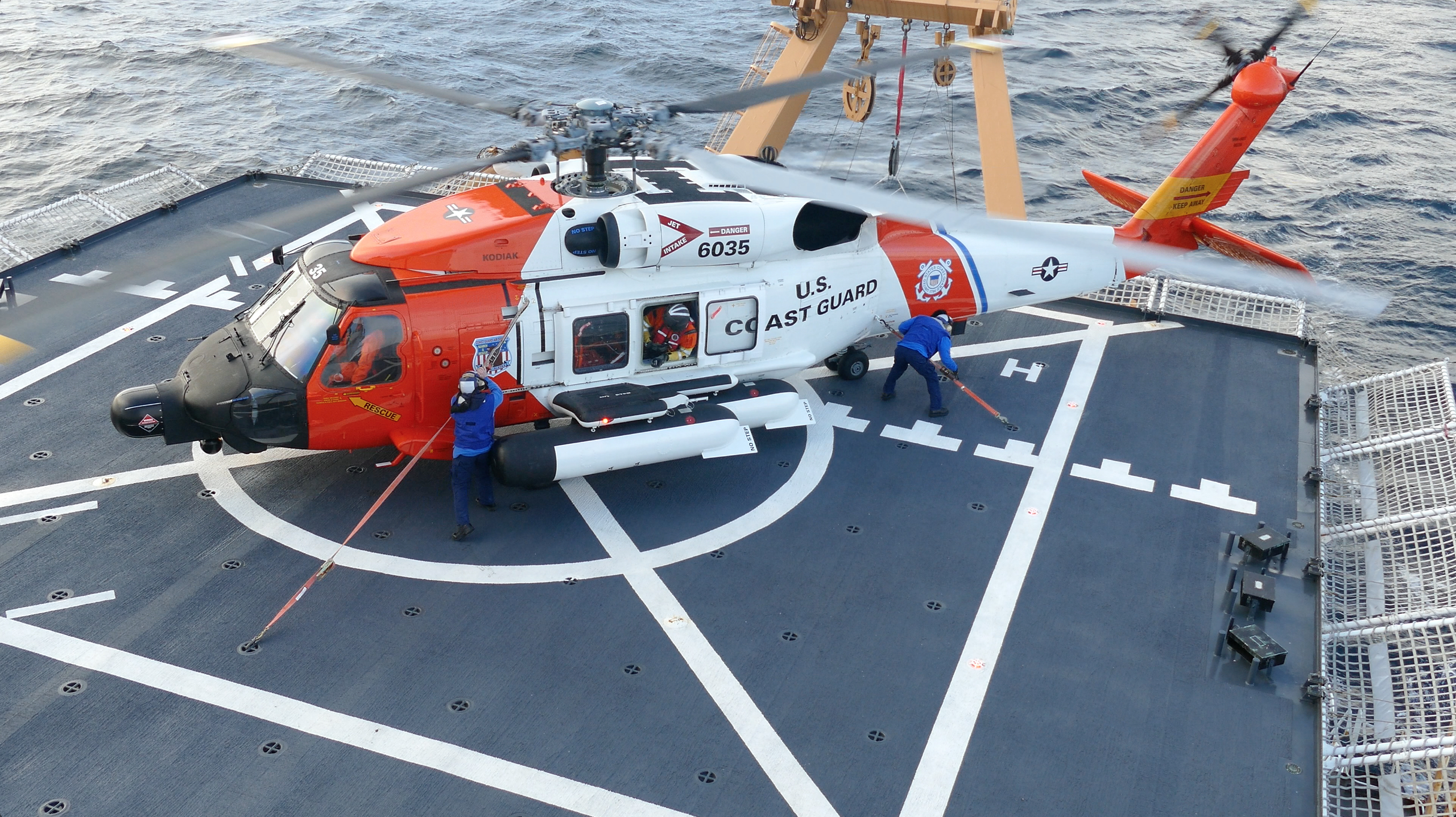 Once the Coast Guard Sikorsky MH-60T Jayhawk helicopter touched down four crew members secured it with tie-down straps. Aboard the USCGC Healy in the Chukchi Sea. 72.02°, -162.50°.