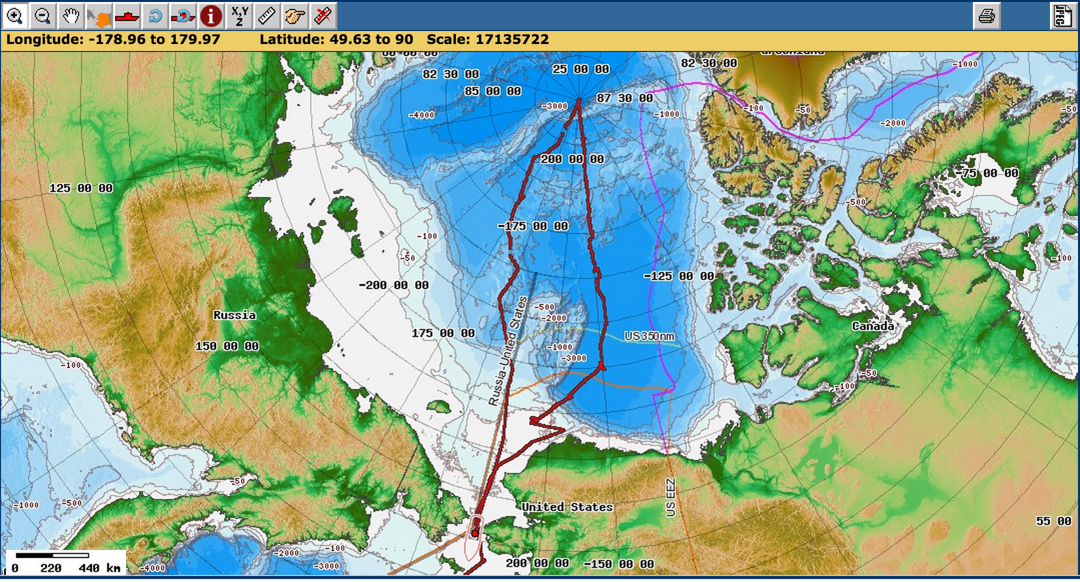 The cruise track map from 9 October shows the Healy's travels through the Arctic Ocean and back again through the Bering Strait. Aboard the USCGC Healy in the Bering Strait. 65.57°, -168.44°.