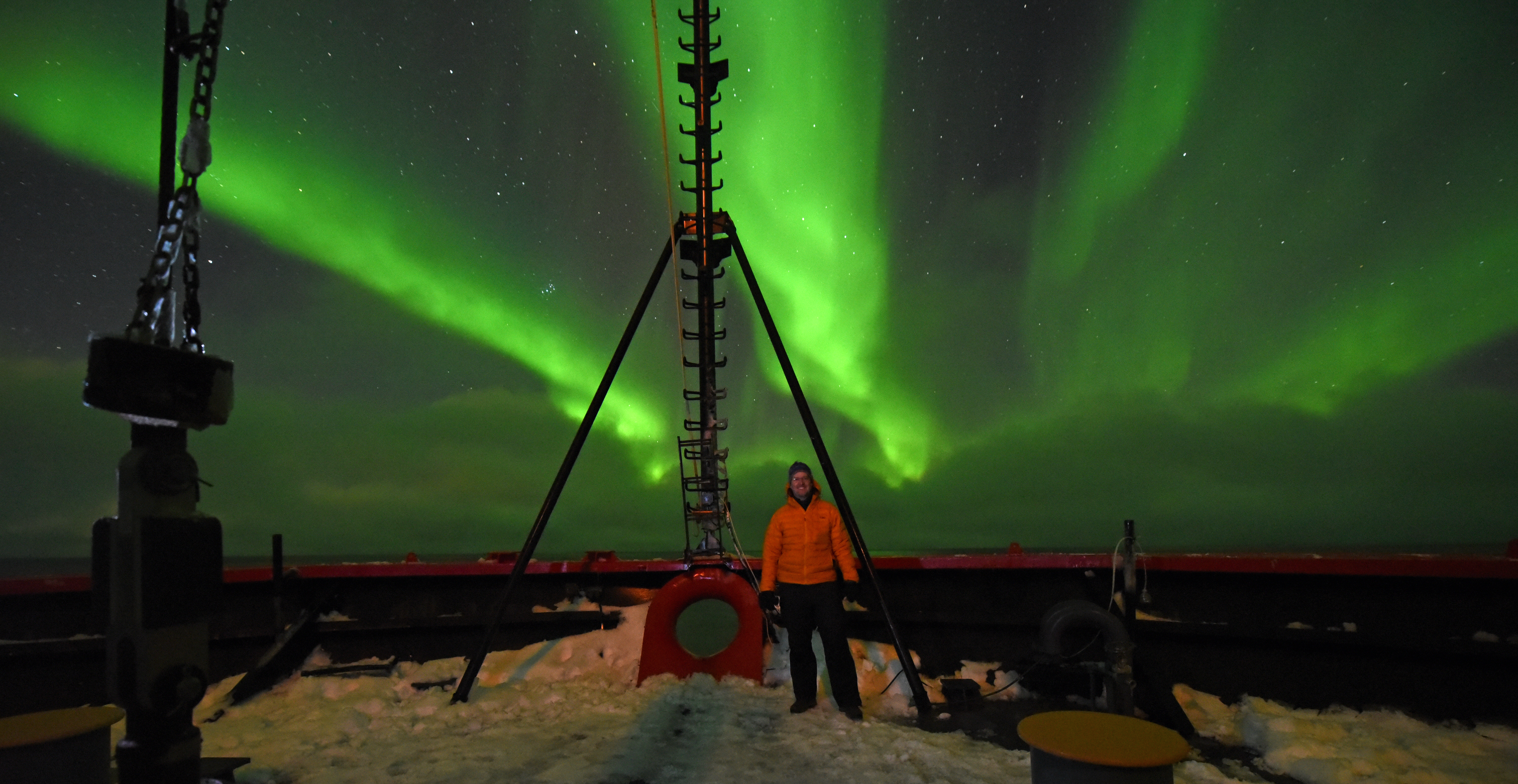 Bill Schmoker poses in front on a display of aurora aboard the USCGC Healy in the north Chukchi Sea. 72.92°, -159.20°
