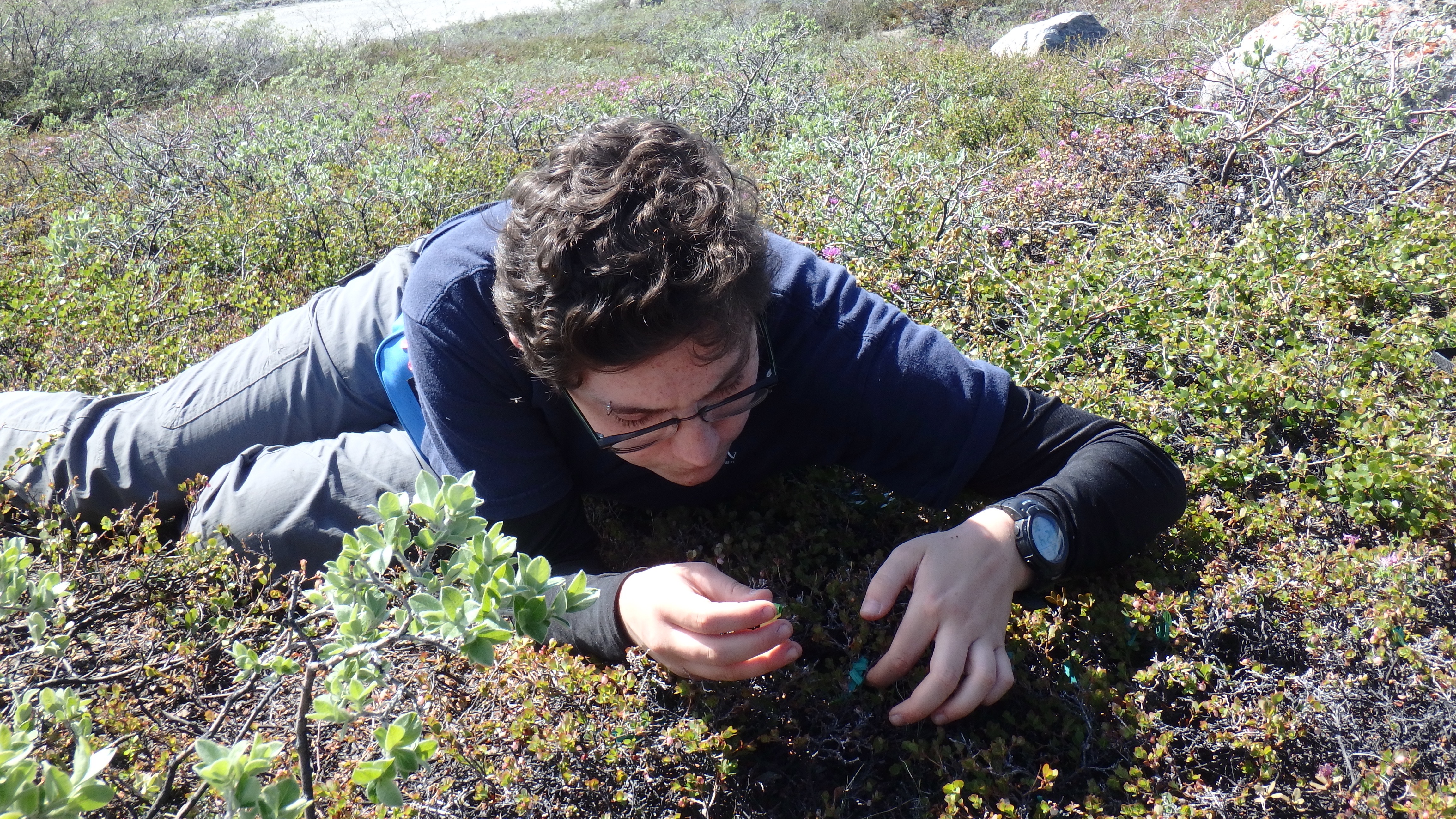 Amber Ahronian hand-pollinates blueberry plants (Vaccinium uliginosum). Kangerlussuaq, Greenland.