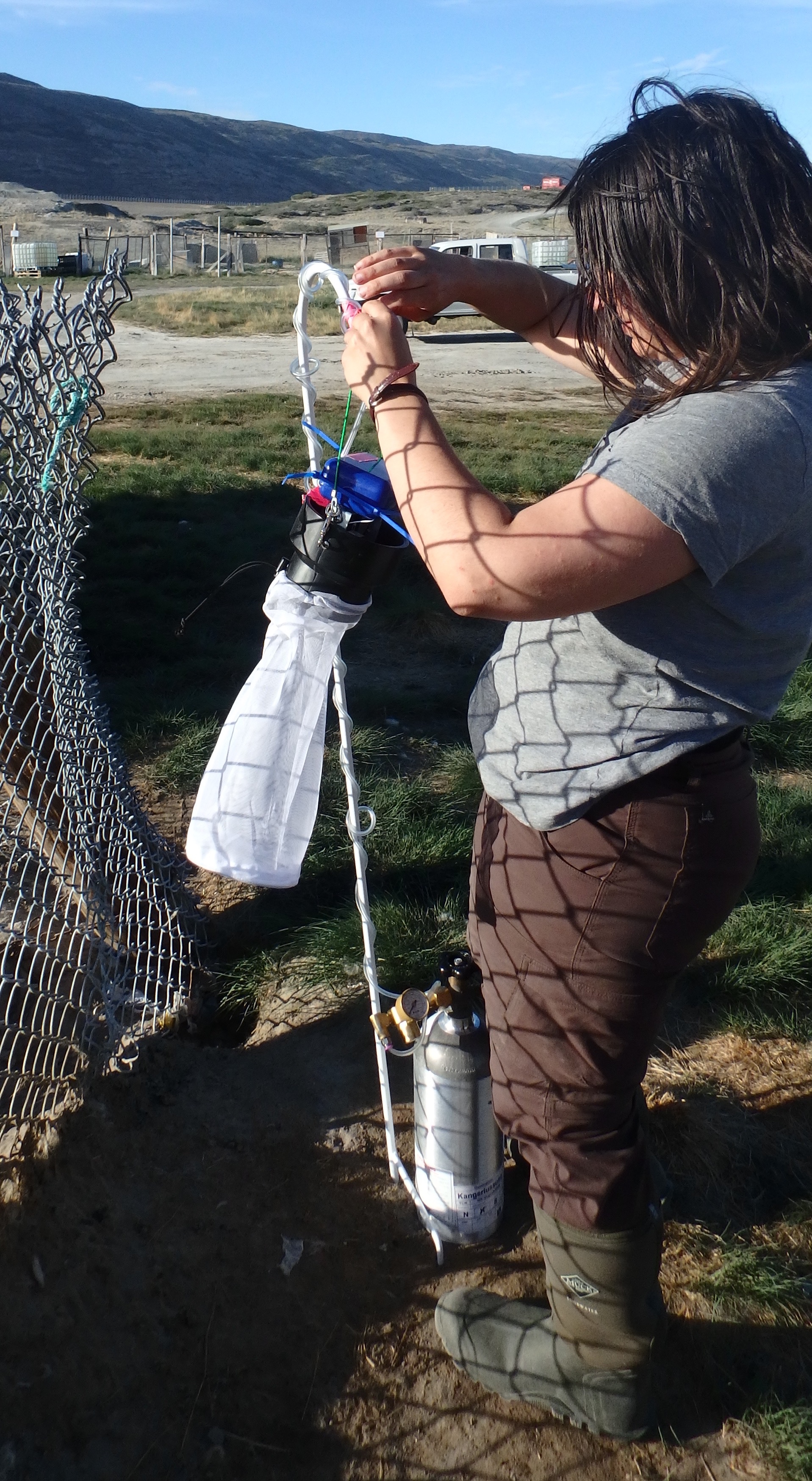 Melissa DiSiervo checks a carbon dioxide mosquito trap. Kangerlussuaq, Greenland.