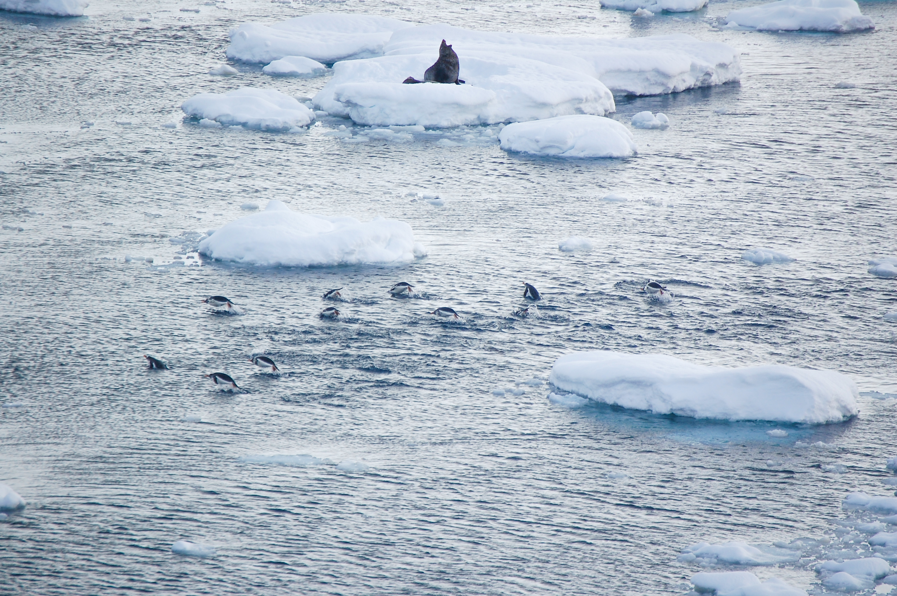 A group of gentoo penguins swims through the water while an Antarctic fur seal vocalizes. Aboard the Nathaniel B. Palmer.