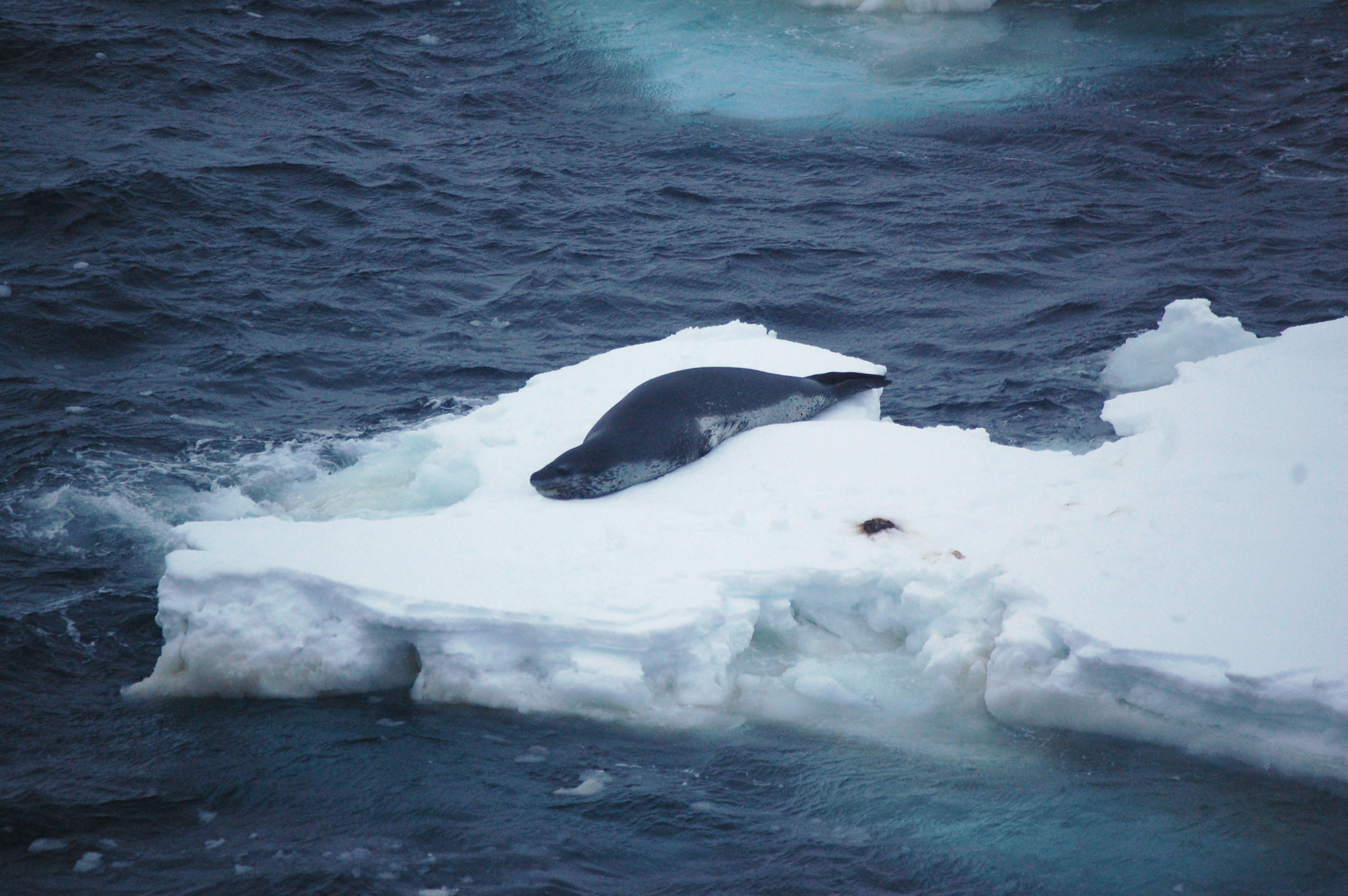 Cara Pekarcik: "An initial look at a leopard seal shows a number of distinct features: reptilian head, sleak body and long foreflippers. This leopard seal remained in this position for most of the sighting." Aboard the Nathaniel B. Palmer.