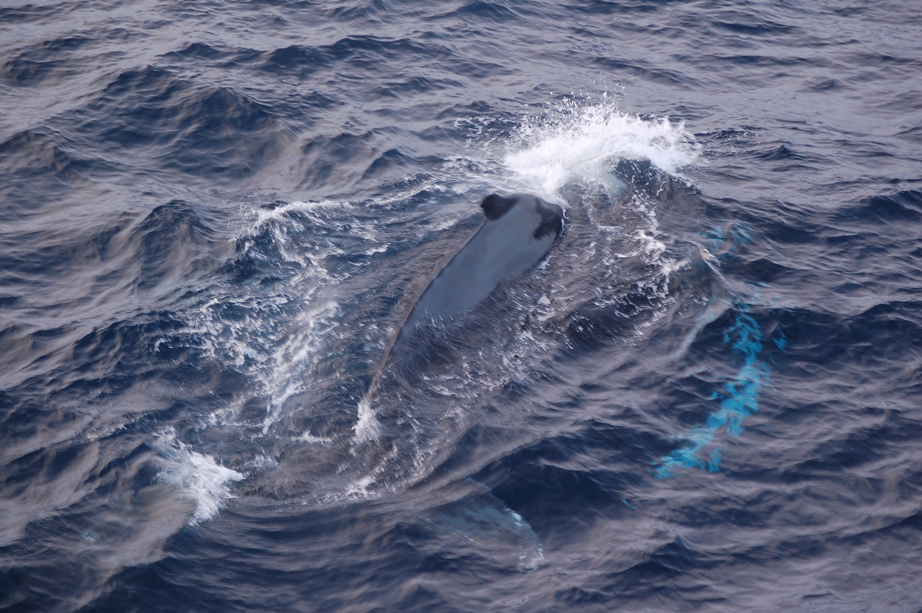 Cara Pekarcik: "This humpback whale surfaced along the starboard side of the Palmer. The bright blue coloration along the right side of the whale is the long pectoral flipper of the whale. The flipper is actually white in color, but below the surface, it reflects the beautiful blue coloration of the water." Aboard the Nathaniel B. Palmer in the Drake Passage.