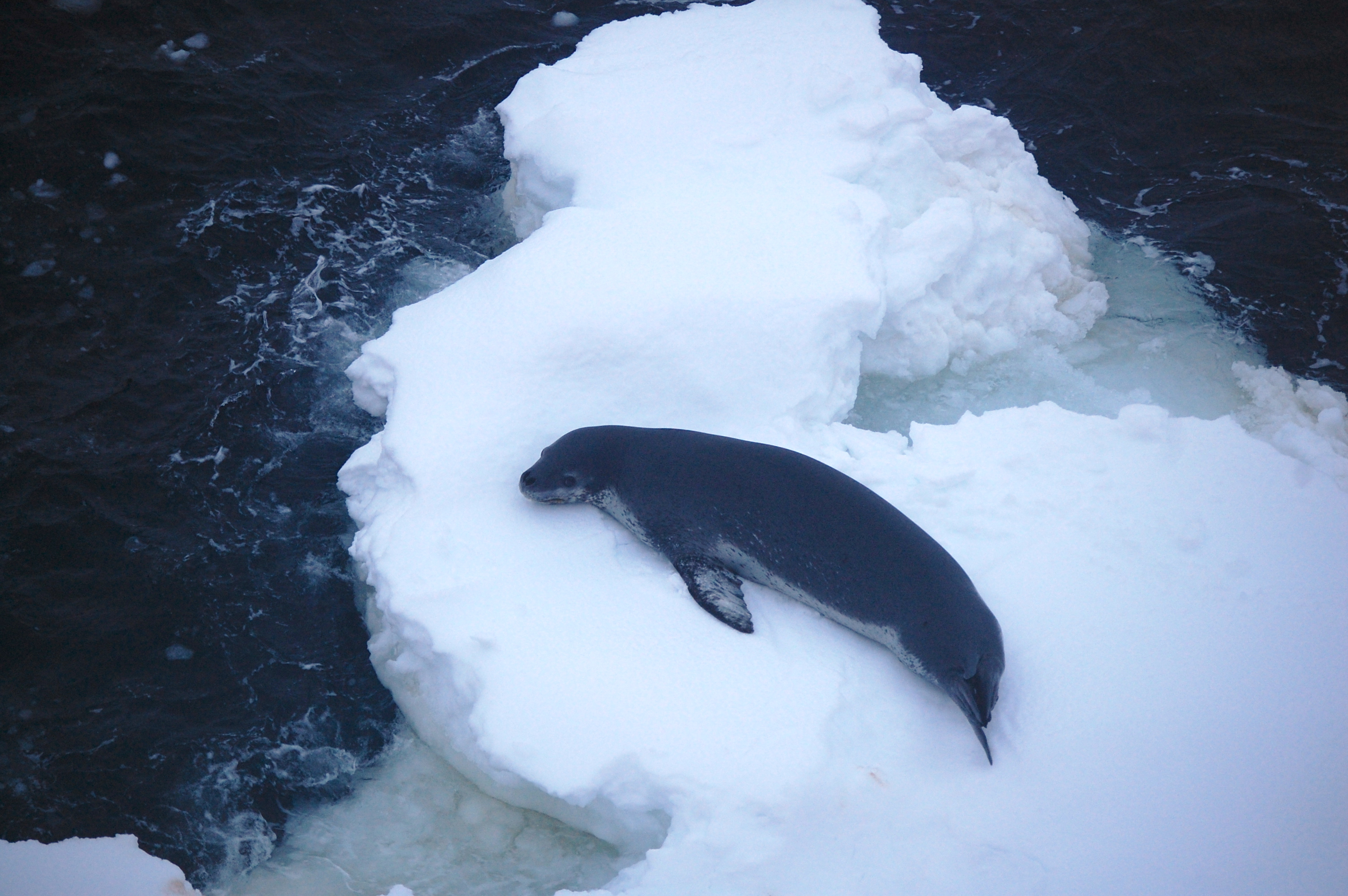 Cara Pekarcik: "The leopard seal lifted its head, presumably to look at the ship. From this angle, you can see the characteristic up-turned nose of the leopard seal and the mouth line that is usually described as a sly smile." Aboard the Nathaniel B. Palmer.