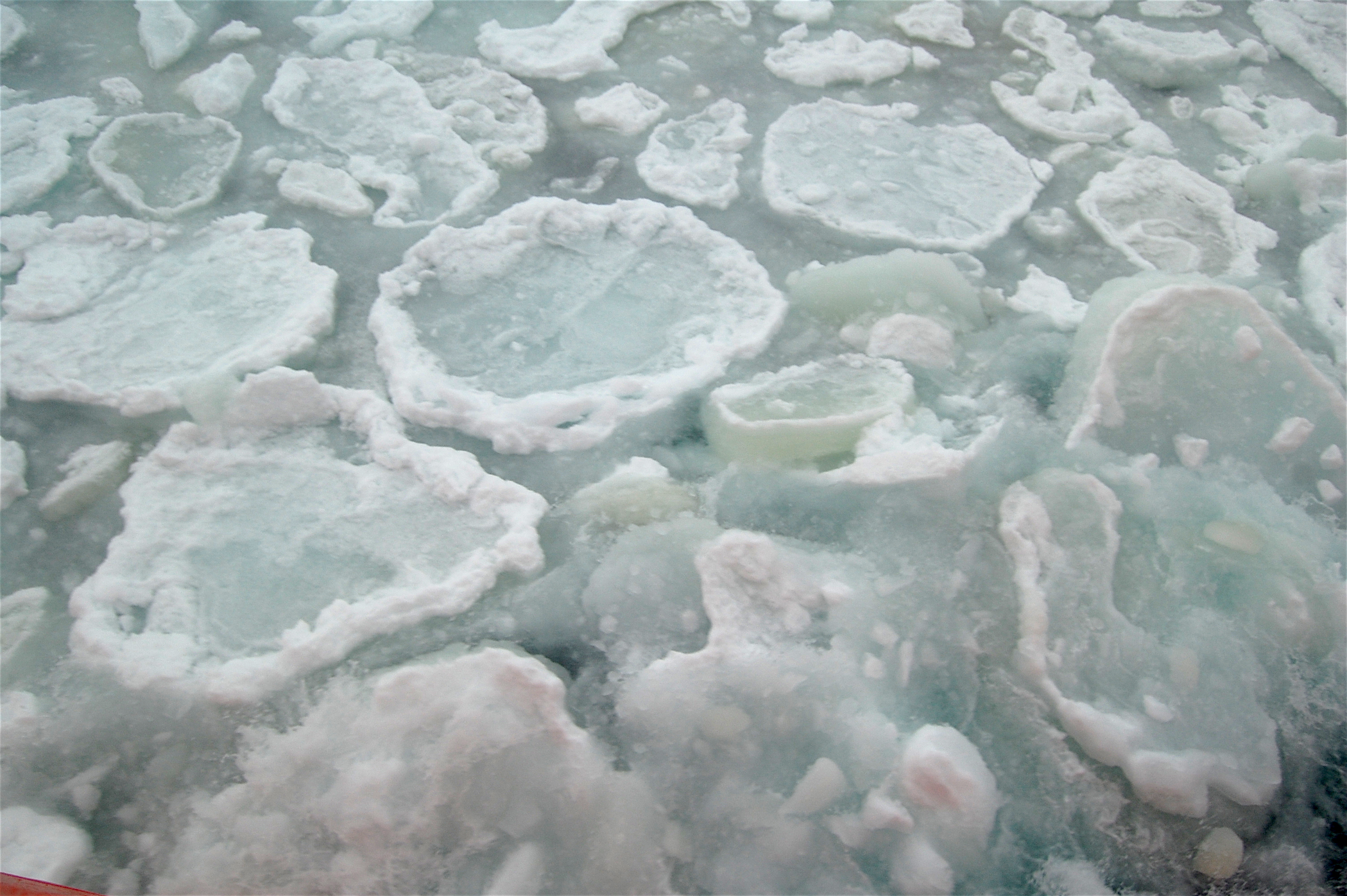 Pancake ice is a piece of new sea ice with raised rims. Some of the pancake ice in this photo looks discolored. This discoloration indicates the presence of algae stuck to the ice. Aboard the Nathaniel B. Palmer.