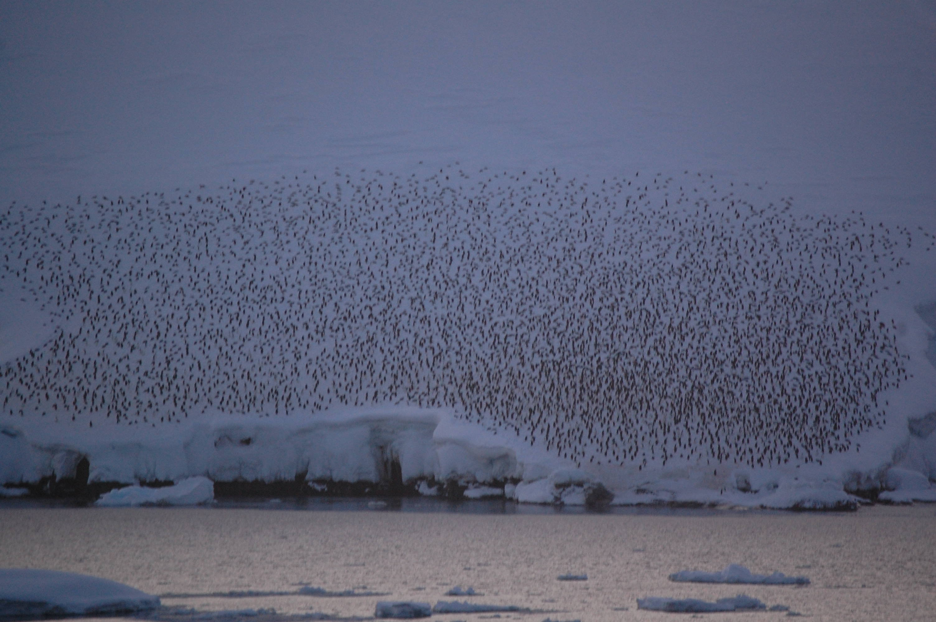 A closer of view of the waddle of penguins sitting on the iceberg. Each black spot is an individual penguin. Aboard the Nathaniel B. Palmer in the Gerlache Strait.