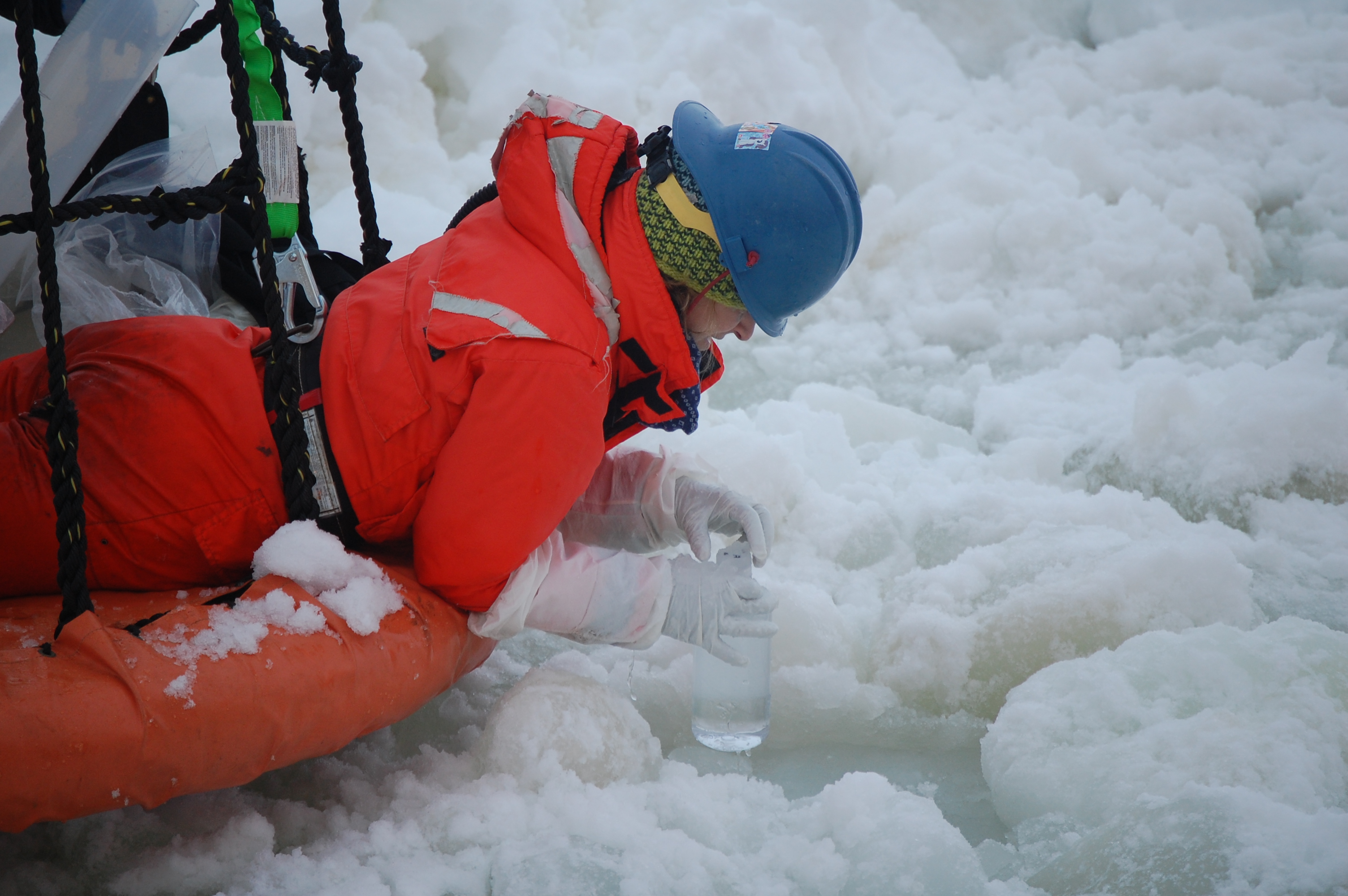In addition to the water pumped into the trace metal clean van, Dr. Kristen Buck collects water samples by dipping bottles into a hole in the surface ice. To help reduce contamination, Dr. Buck wears gloves as well as sleeves to cover the required float coats. Aboard the Nathaniel B. Palmer.
