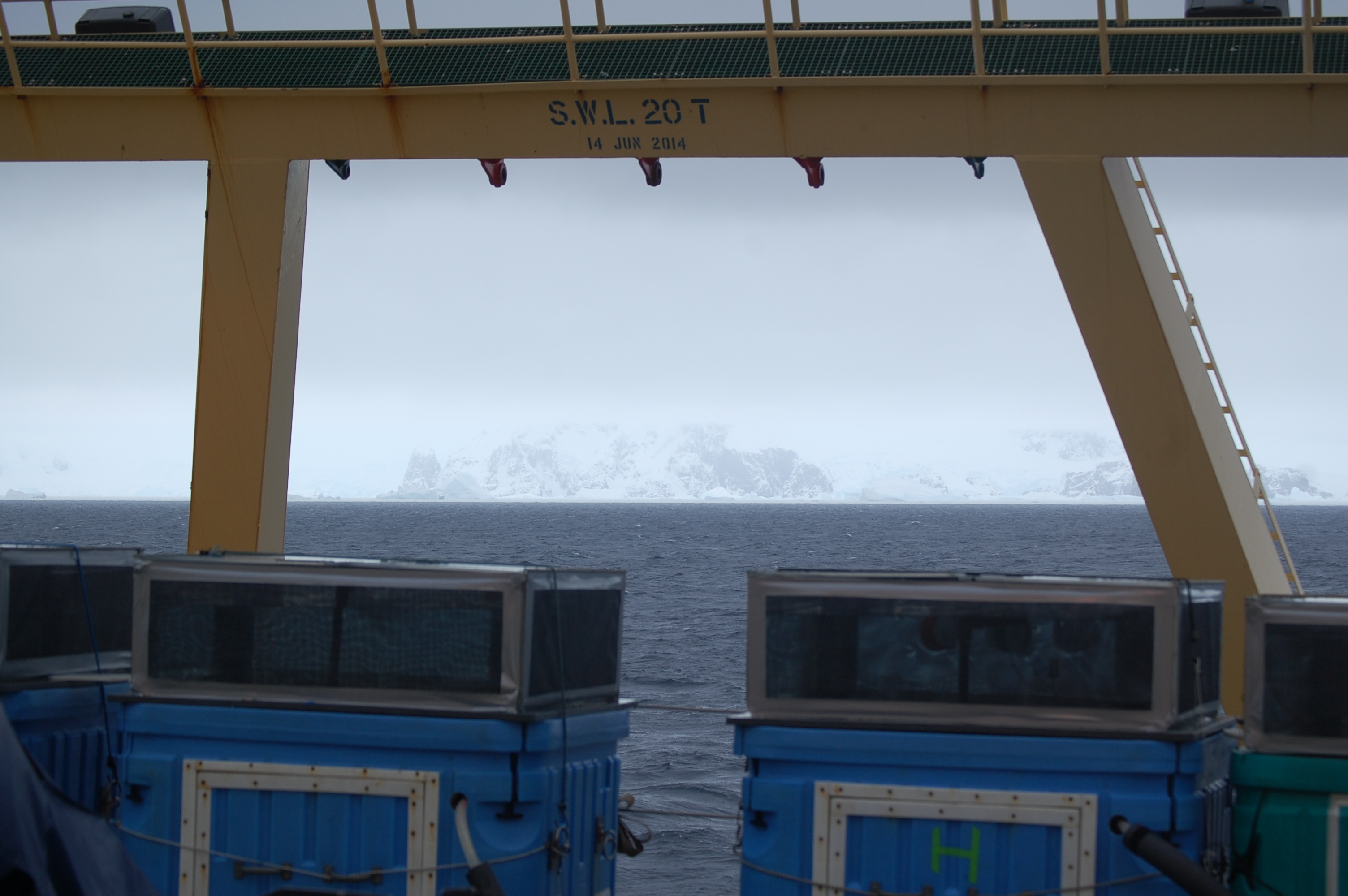 The flow-through incubators bring sea water through pumps to the incubators. This allows the bottles to receive ambient (natural) temperature and light during incubation. Aboard the Nathaniel B. Palmer.