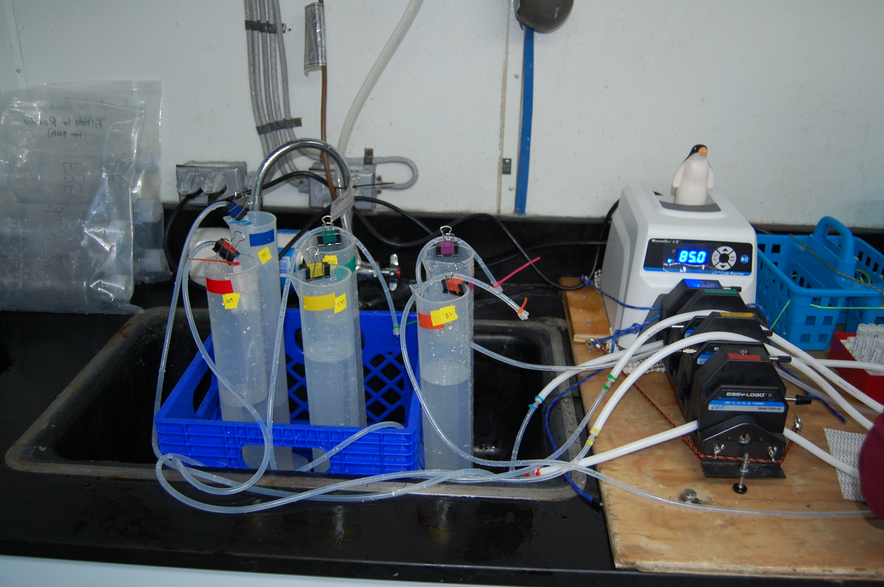 This peristaltic pump, located in the walk-in cooler known as Big Antarctica, is used to filter water from the incubation samples. The colored tape on each graduated cylinder corresponds to the colors of each incubation group (A-F). As water flows through the pump (right) it travels through tubes to a filter. Diatoms are collected on the filter and the water collects in the graduated cylinders. Aboard the Nathaniel B. Palmer.