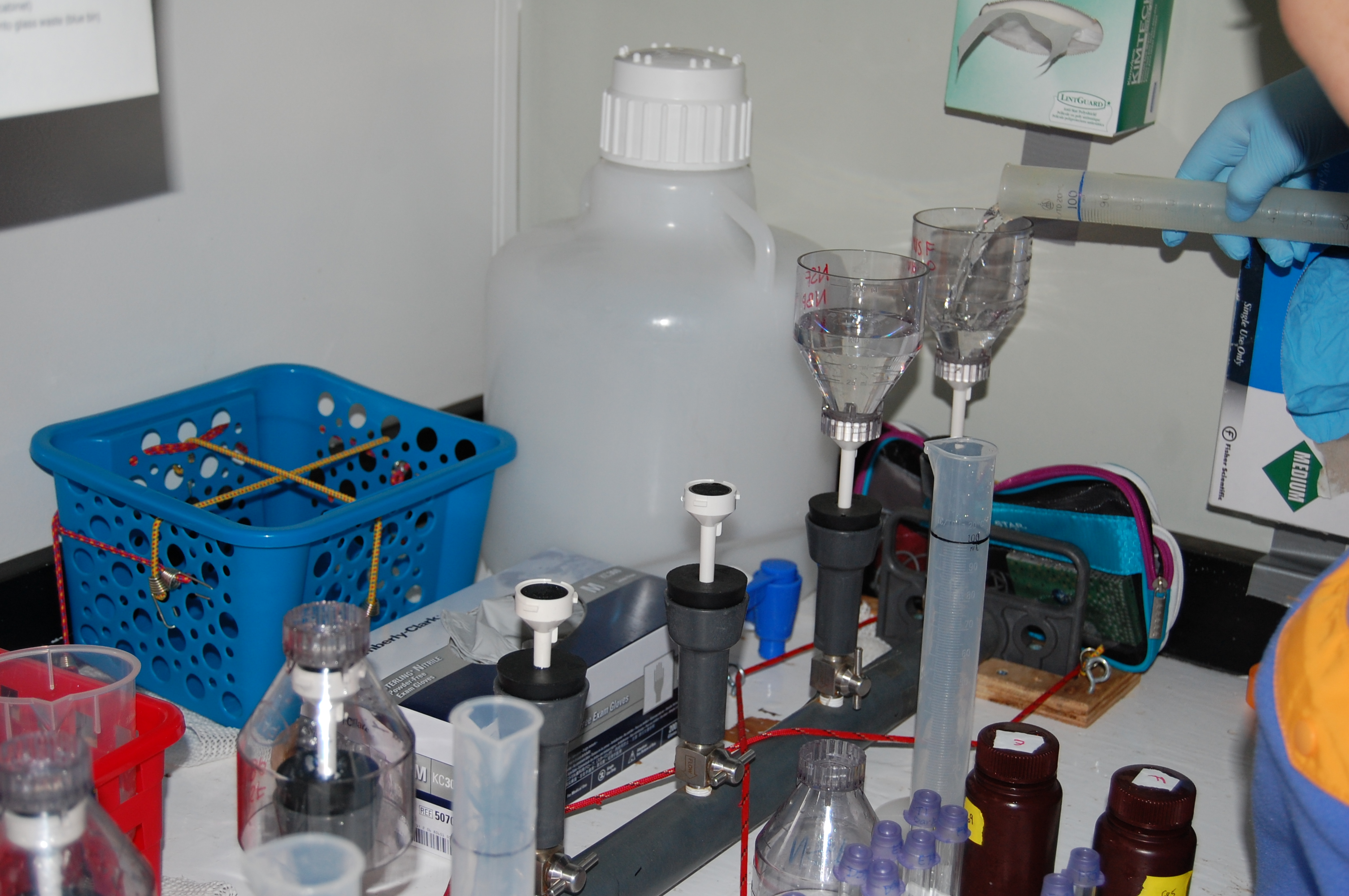 Water samples are filtered at this station in order to test for chlorophyll levels. Each clear funnel has a filter at the base to remove biomass (living samples). This biomass sample is then stored in 95% ethanol for 12-24 hours. After the time period, the chlorophyll level is read using a fluorometer. Aboard the Nathaniel B. Palmer.