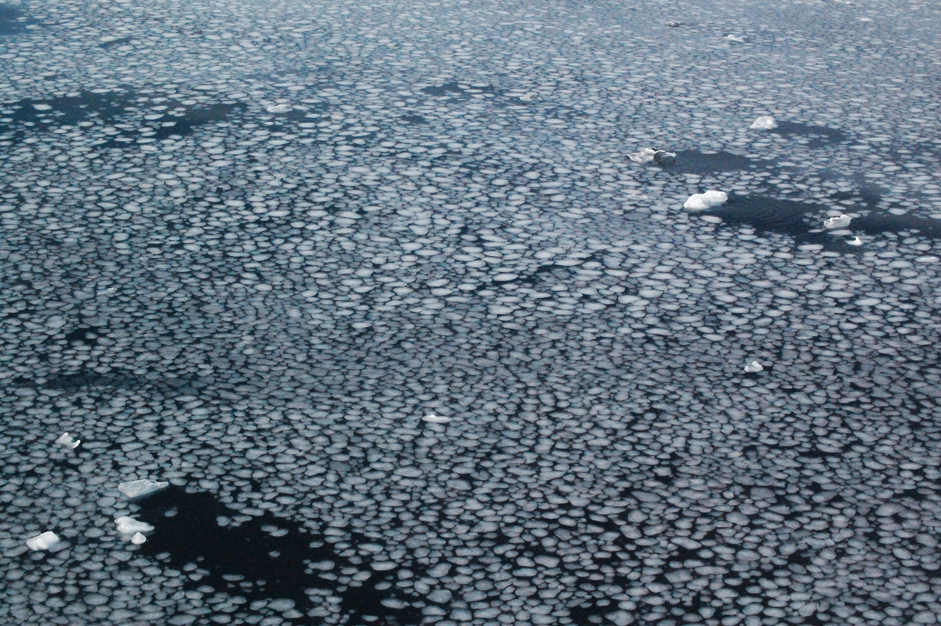 These 'baby pancakes' are only 2-3 inches in diameter. These pancakes begin to form as ice crystals on the surface of the seawater bunch together. Aboard the Nathaniel B. Palmer.