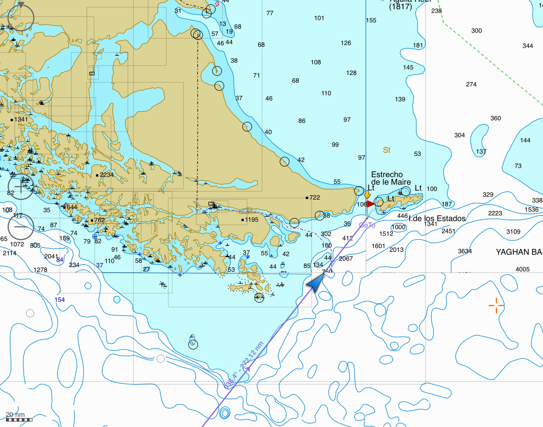Cara Pekarcik: "The small blue triangle indicates the location of the Palmer on the morning of 10-13-16. The small group of islands to the left of the ship are part of the Tierra del Fuego archipelago. The southernmost island is the location of the infamous Cape Horn." Aboard the Nathaniel B. Palmer east of Cape Horn, Chile.