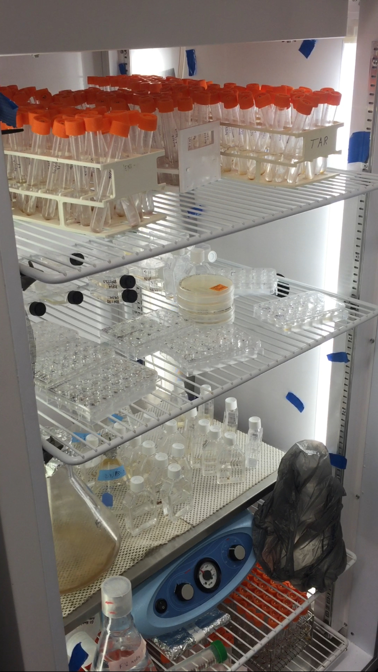 A refrigeration unit (temperature holds steady at 2 degrees Celsius) holding Antarctic diatom and bacteria cultures for use in the Jenkins lab. University of Rhode Island in Kingston, Rhode Island.