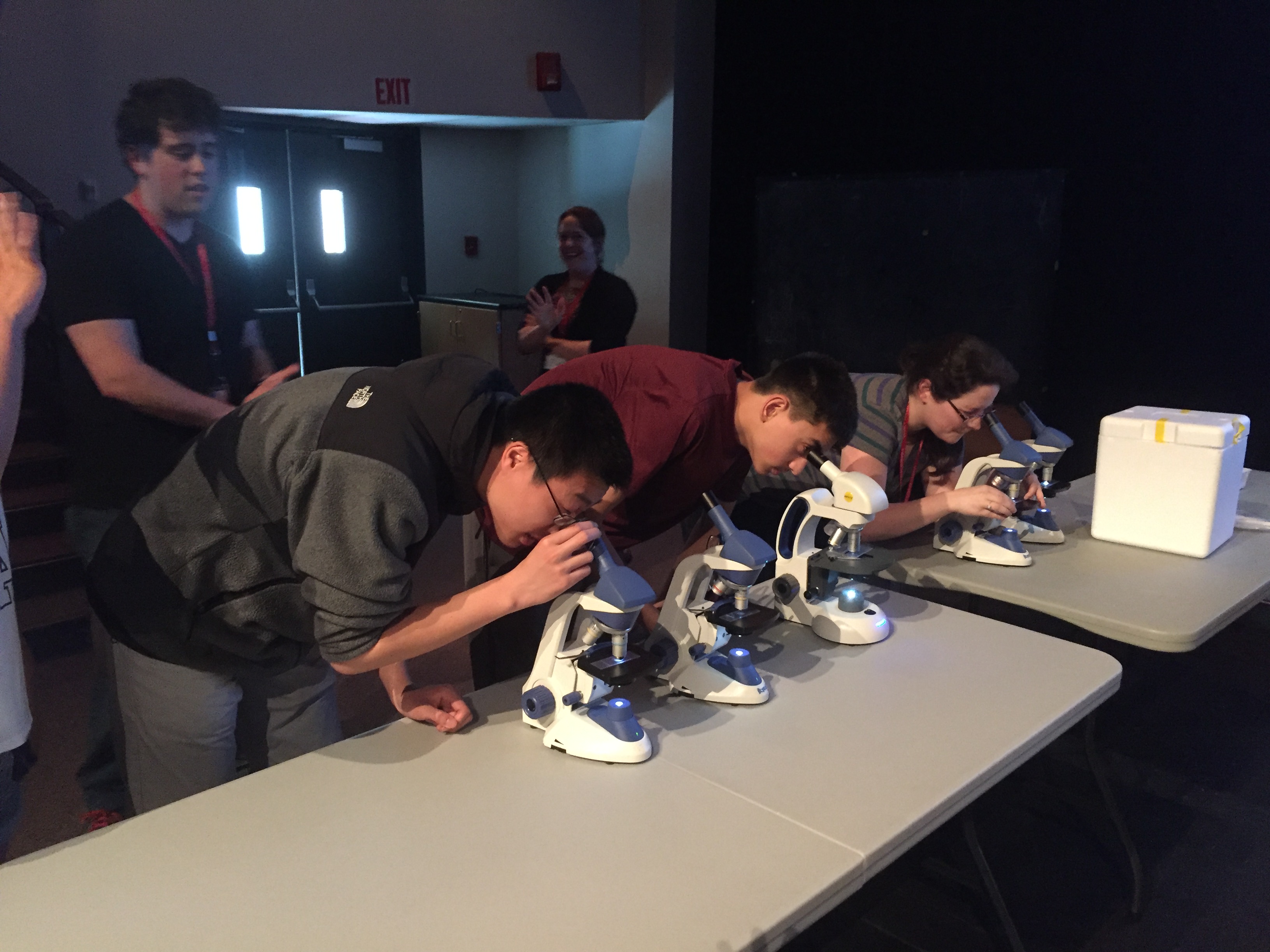University of Rhode Island student Laura Filliger (far right) assists North Quincy sophomores Ryan Pham (left) and Andrew Tham (center) in viewing diatom samples from Narragansett Bay and previous Southern Ocean cruises. North Quincy High School in Quincy, Massachusetts.