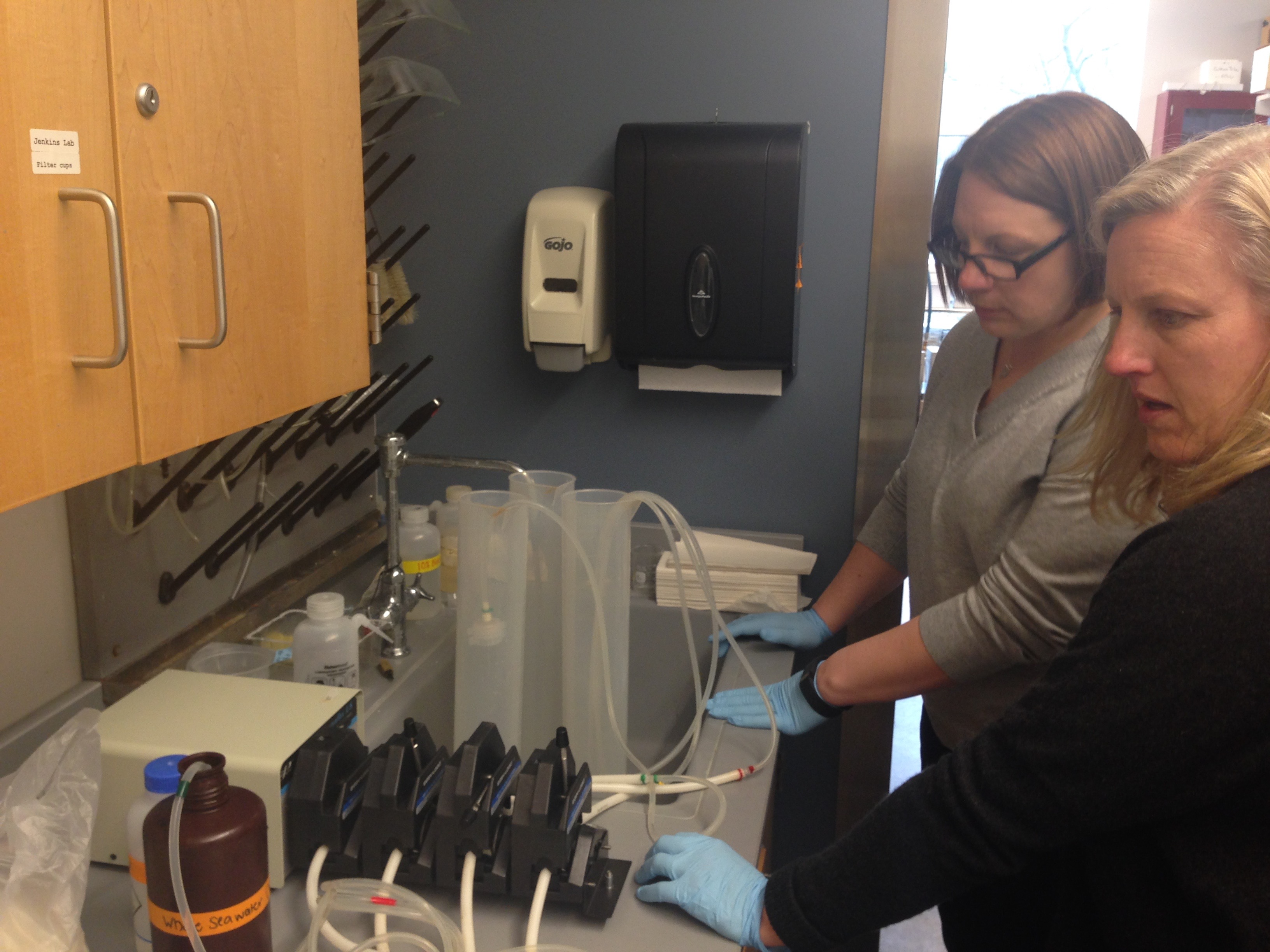 Dr. Bethany Jenkins and Cara Pekarcik use the peristaltic pump to filter plankton for storage. When these samples are collected during the expedition, they will be stored for DNA testing back at the URI lab. University of Rhode Island in Kingston, Rhode Island.