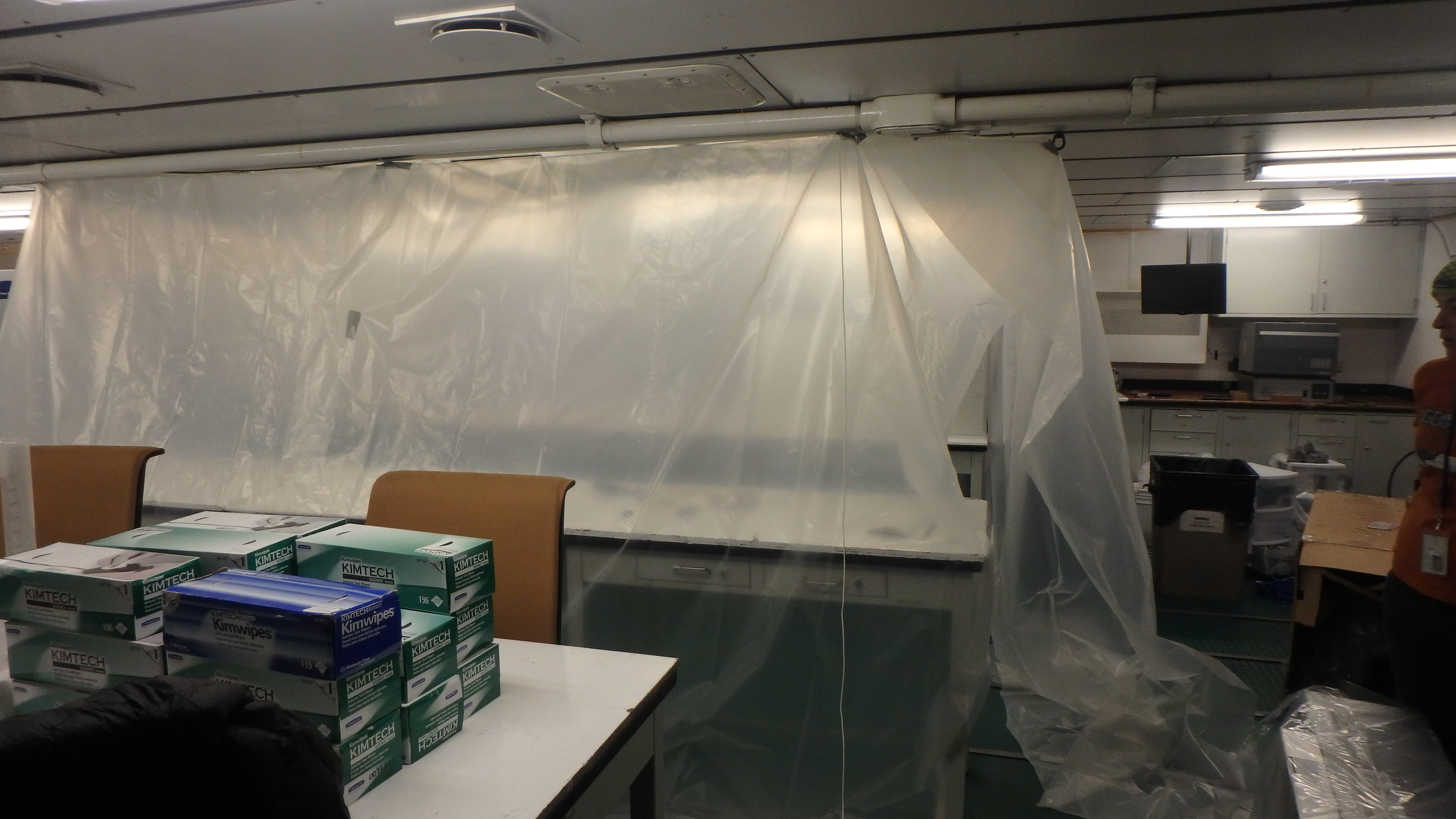 The first layers of plastic begin to form the Trace Metal Clean (TMC) bubble. Once complete, the air inside the bubble will be filtered to help reduce the amount of contaminants in the work area. Aboard the Nathaniel B. Palmer, docked in Punta Arenas, Chile.