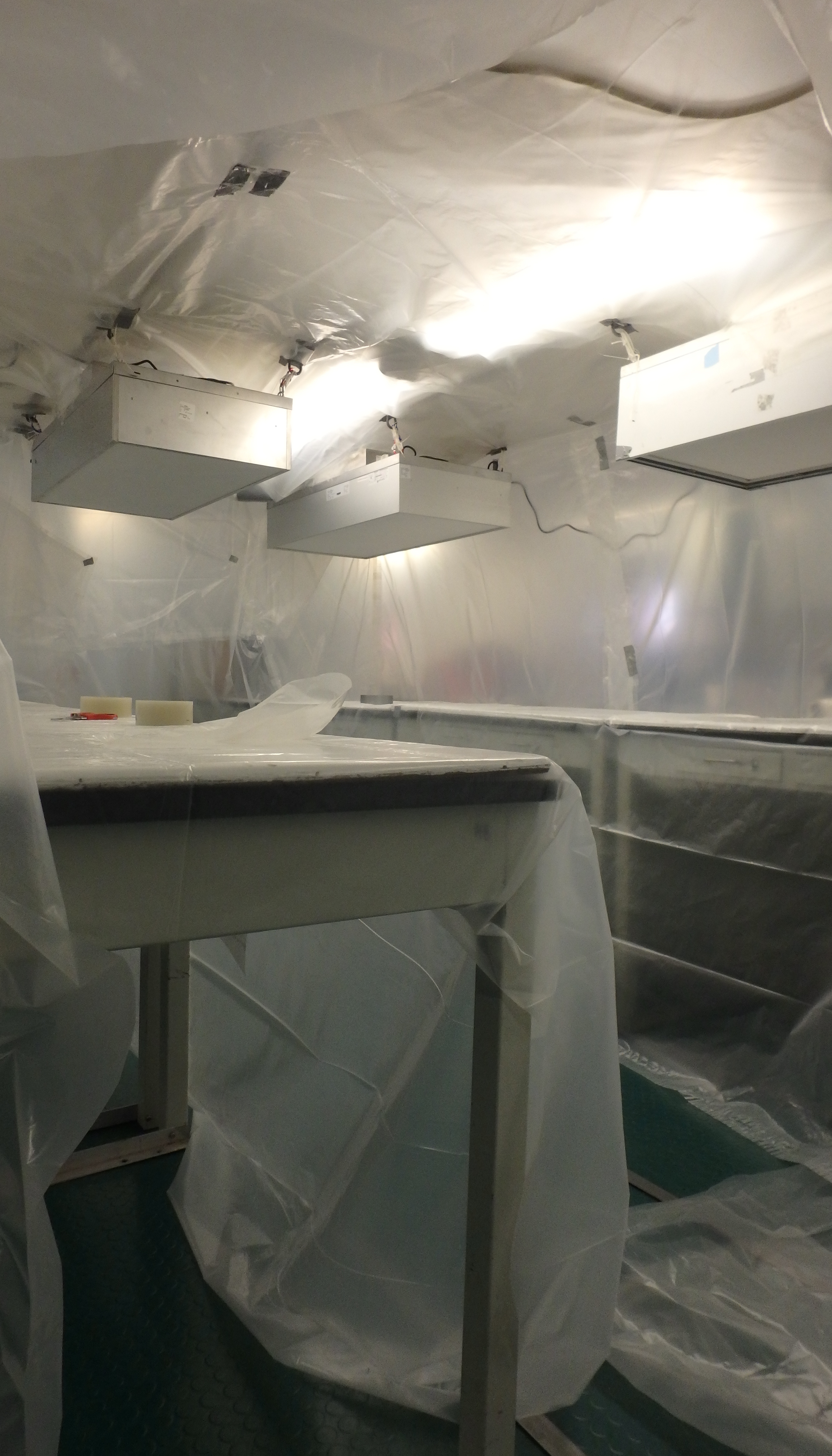 The HEPA filters are installed and begin filtering small particles from the air to create a clean space for the trace metal scientists. Aboard the Nathaniel B. Palmer, docked in Punta Arenas, Chile.