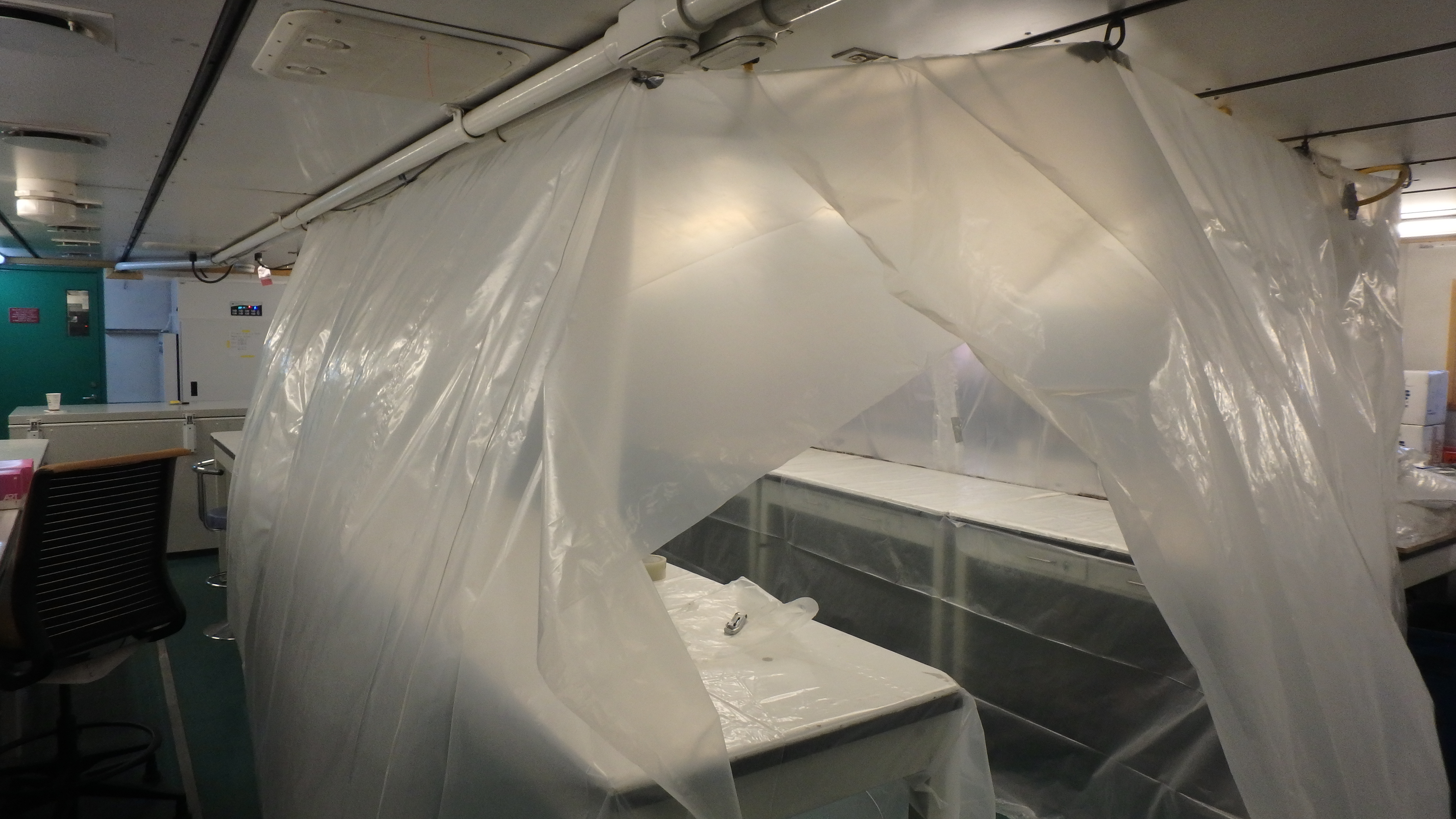 Once the HEPA filters are running, the air flow and change in pressure cause the plastic to expand and create a real bubble around the lab area. Aboard the Nathaniel B. Palmer, docked in Punta Arenas, Chile.
