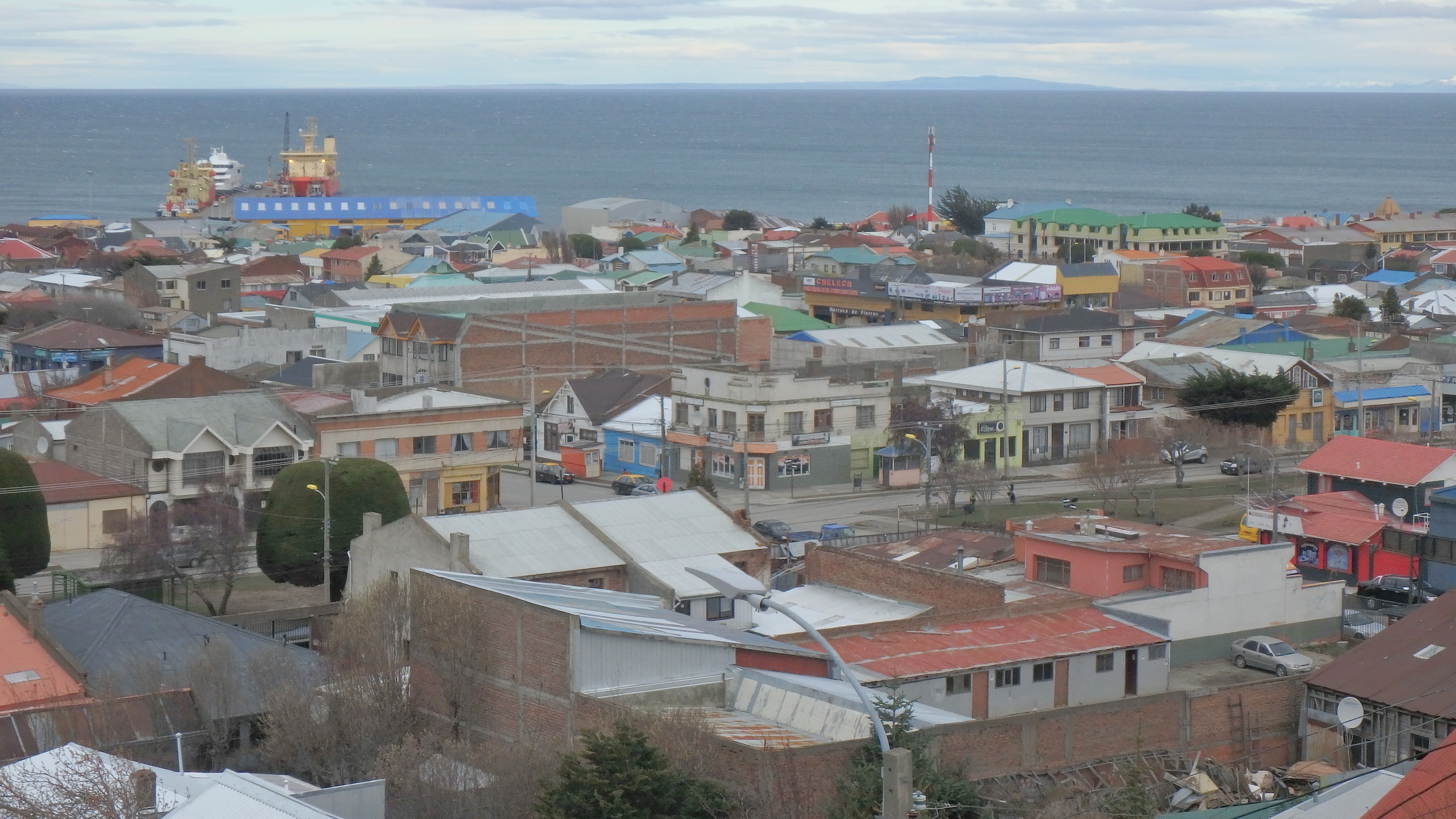 A view of Punta Arenas (including the R/V Nathaniel B. Palmer in the distance) from the Cerro Mirrador la Cruz overlook. The overlook provides a view of the Straight of Magellan, distant mountains, and much of Punta Arenas, Chile.