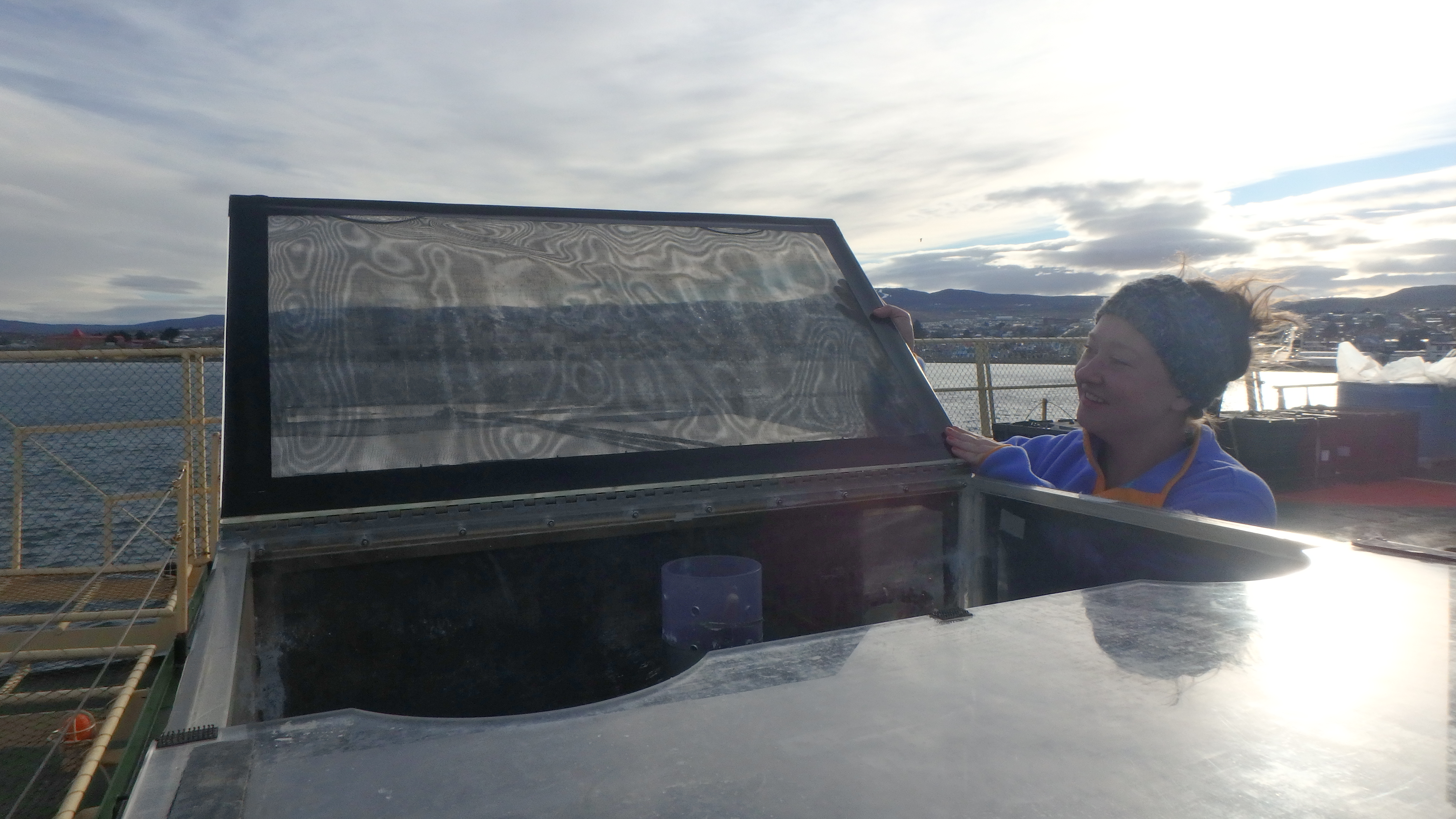 Graduate student Alexa Sterling prepares to close the lid on one of the deck board incubators. The neutral density screening (black screen door mesh) is placed on all sides of the incubator to reduce the light to simulate conditions around 10m (~30ft) below the surface of the water. Aboard the Nathaniel B. Palmer, docked in Punta Arenas, Chile.