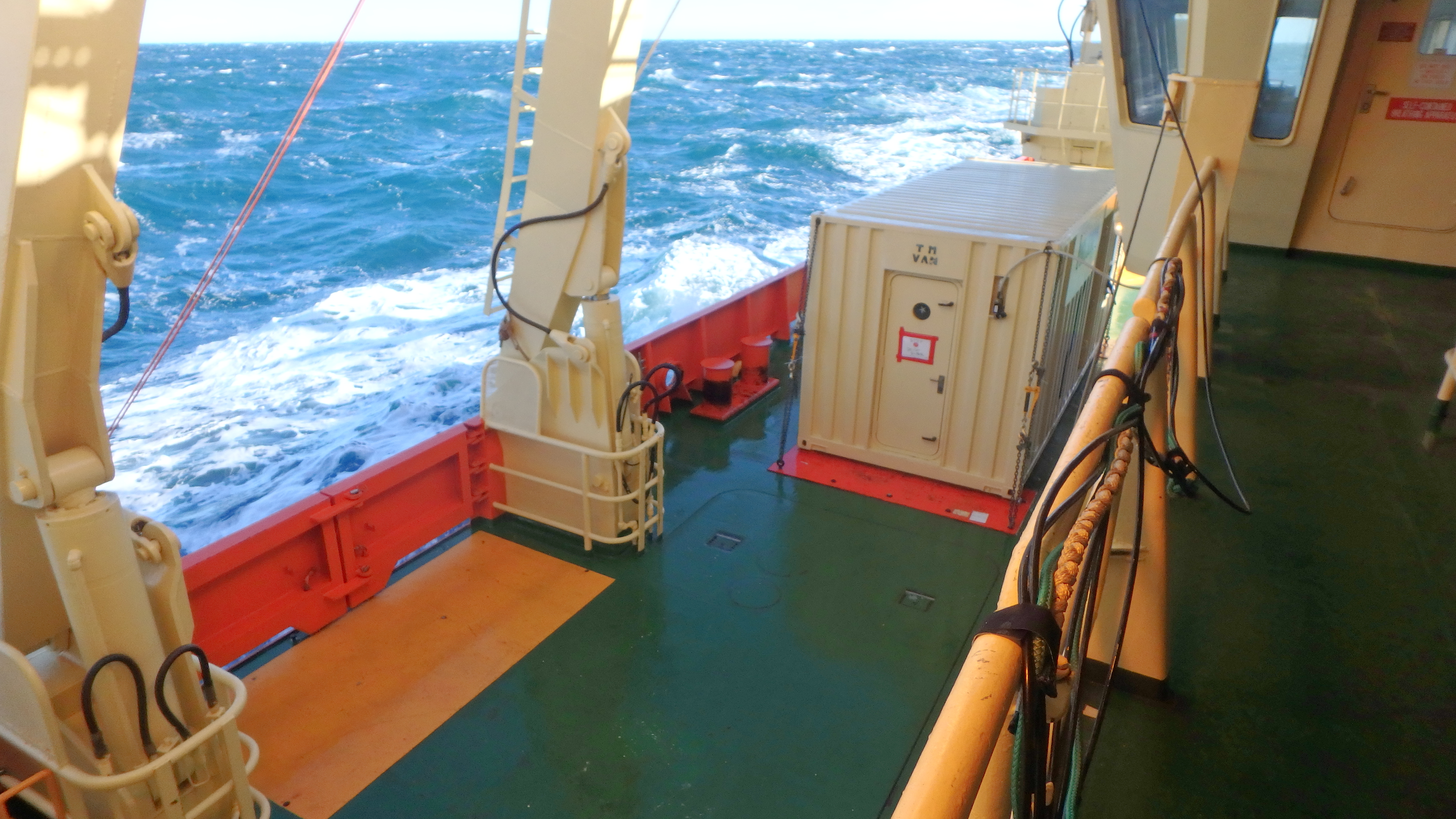 Cara Pekarcik: "High winds and open water can create larger sea conditions. Notice the main deck area (painted green) is wet from the large waves hitting the side of the boat and pushing across the deck. Waterproof shoes are definitely required to move on deck in this weather." Aboard the Nathaniel B. Palmer.