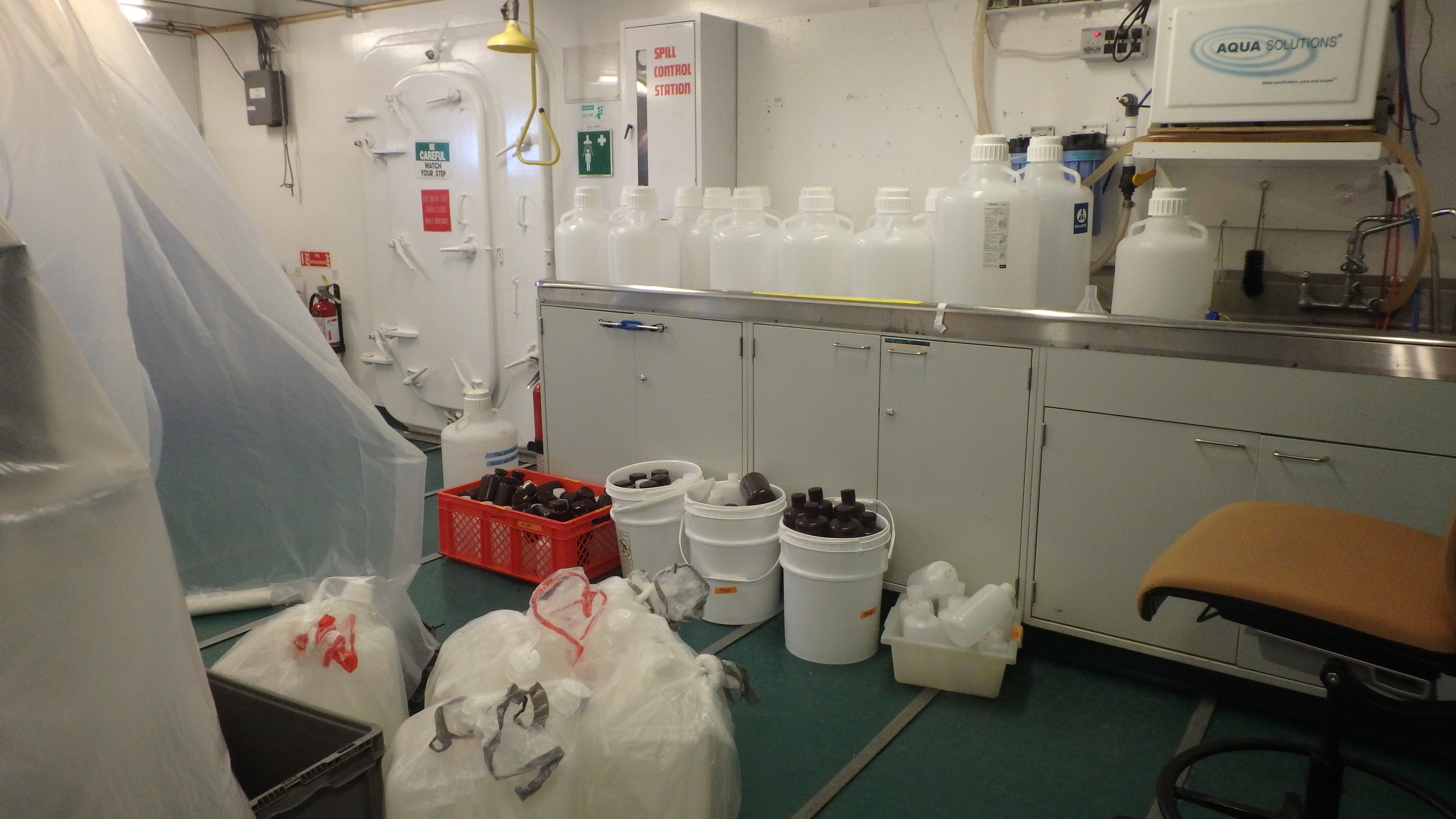 Various sizes of bottles can be found throughout the ship. These bottles will be used for incubation experiments, speciation studies and sea water transport. Aboard the Nathaniel B. Palmer.
