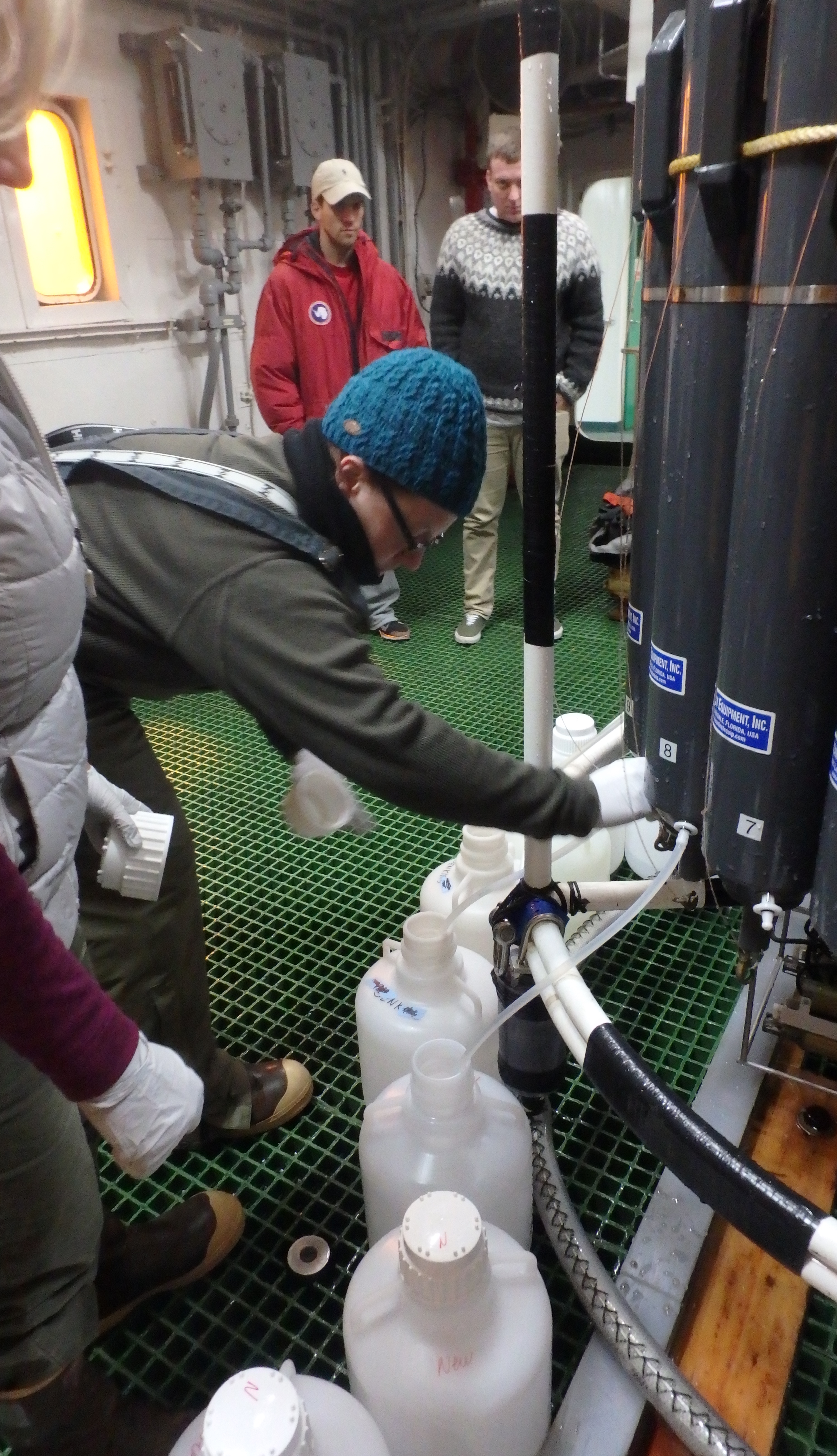 Cara Pekarcik learns how to empty Nisken bottles from the conventional CTD (conductivity, temperature, and depth) instrument rosette. These Nisken bottles are not removed from the rosette because they do not require trace metal clean techniques. Aboard the Nathaniel B. Palmer.