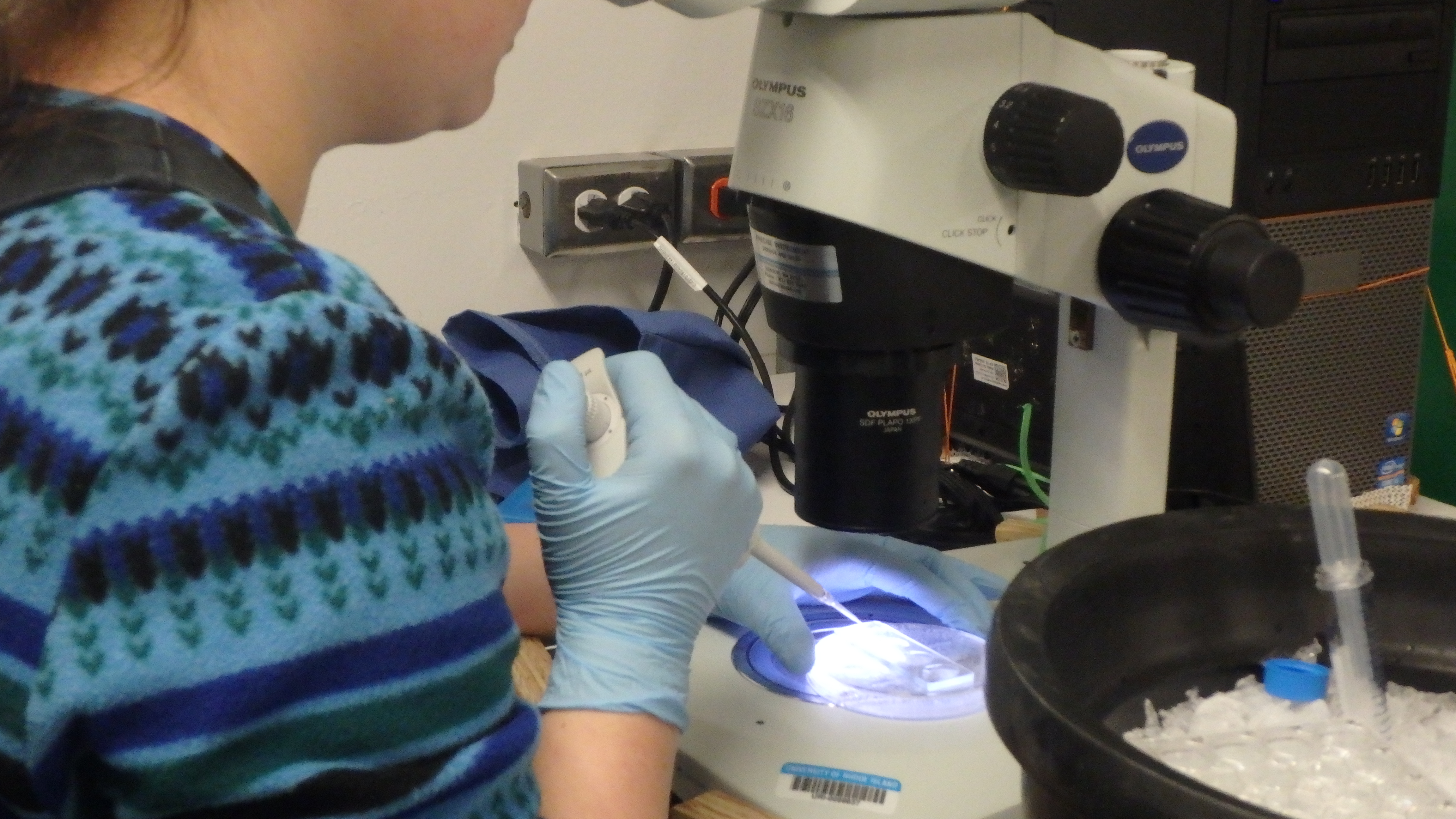 Laura Filliger uses a pipette capable of collecting extremely small volumes of liquid to capture a single diatom and move it through sterile media before it is stored for culture. Aboard the Nathaniel B. Palmer.