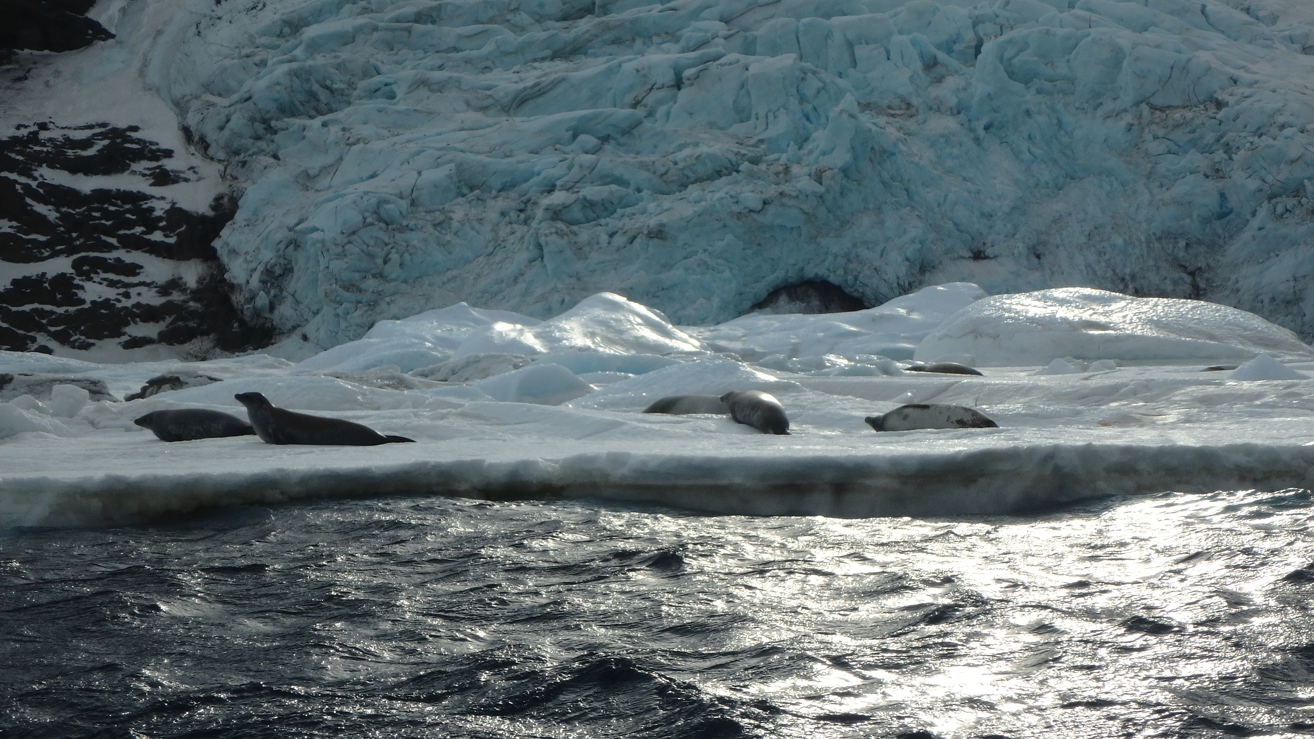 Crabeater seals relax on the fast ice as Small Boat 1 moves towards the sediment covered ice ahead. Aboard the zodiac, near the Nathaniel B. Palmer in Duse Bay.