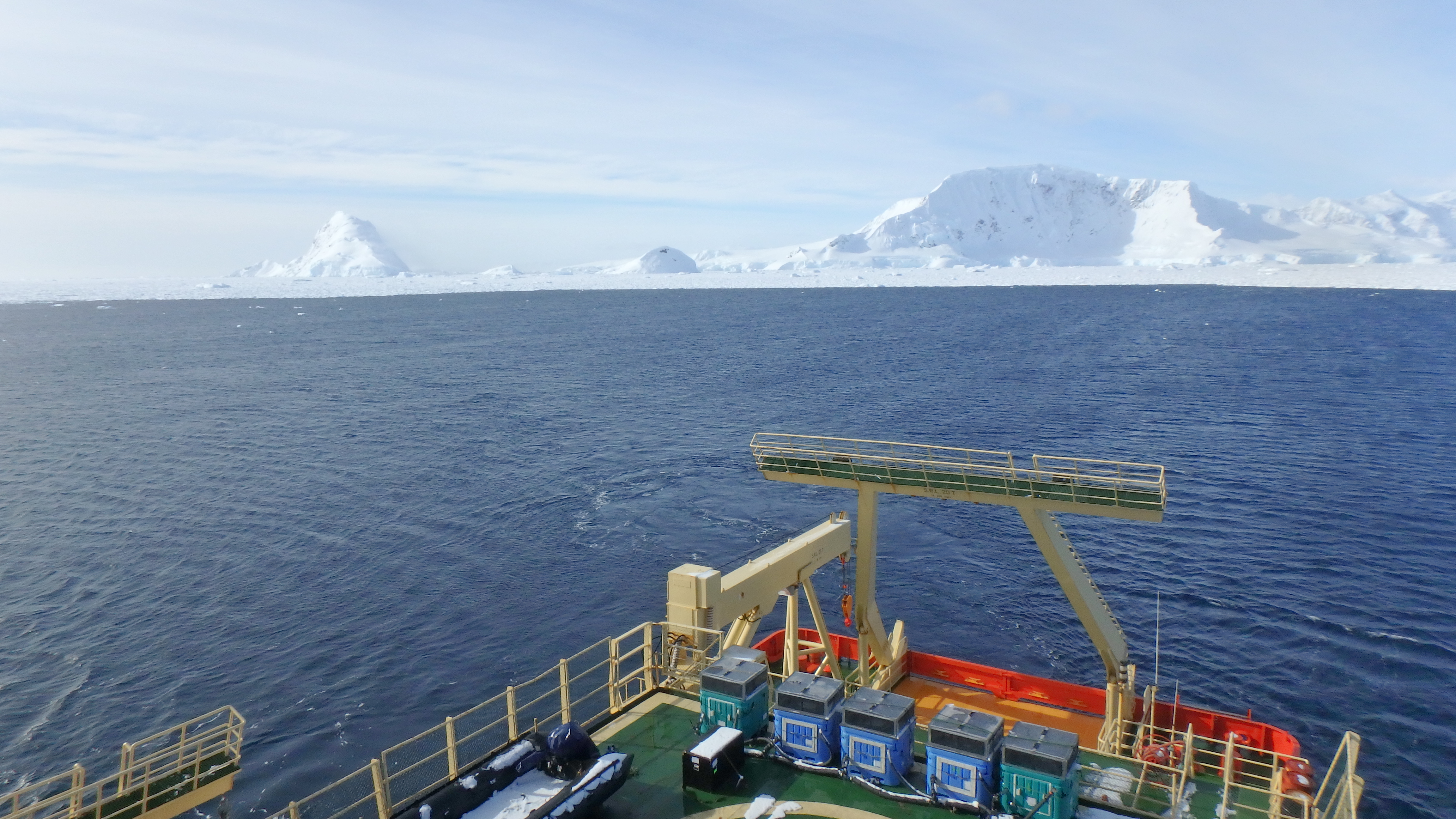 A view of Wilhelmina Bay from the bridge deck of Palmer, looking aft (towards the back of the ship). Aboard the Nathaniel B. Palmer in Wilhelmina Bay.