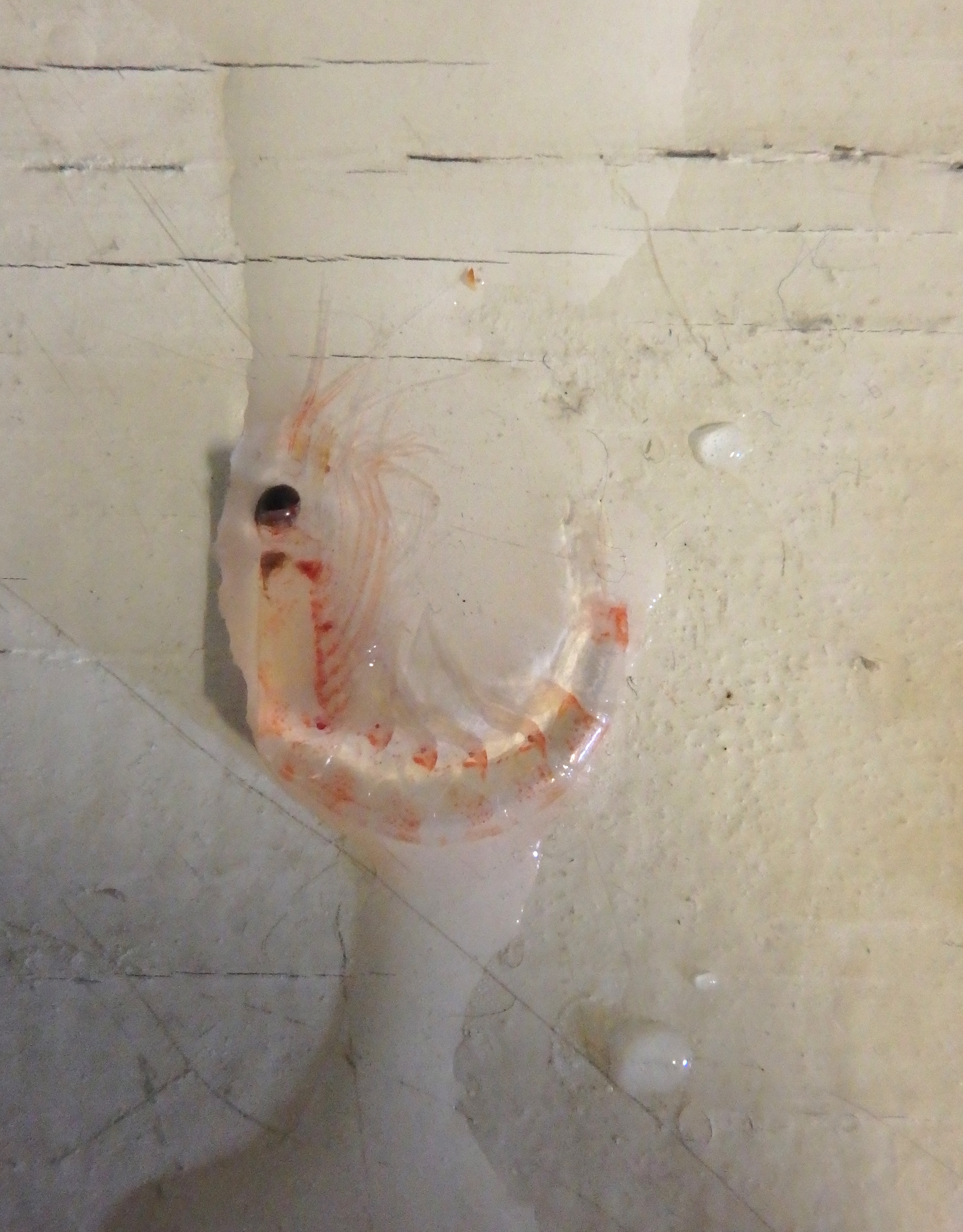 Cara Pekarcik: "Antarctic krill have a hard, clear exoskeleton and some red coloration throughout their bodies. When the krill feed on phytoplankton, you can also see a small green tint in the middle of their bodies – a stomach full of diatoms!" Aboard the Nathaniel B. Palmer.