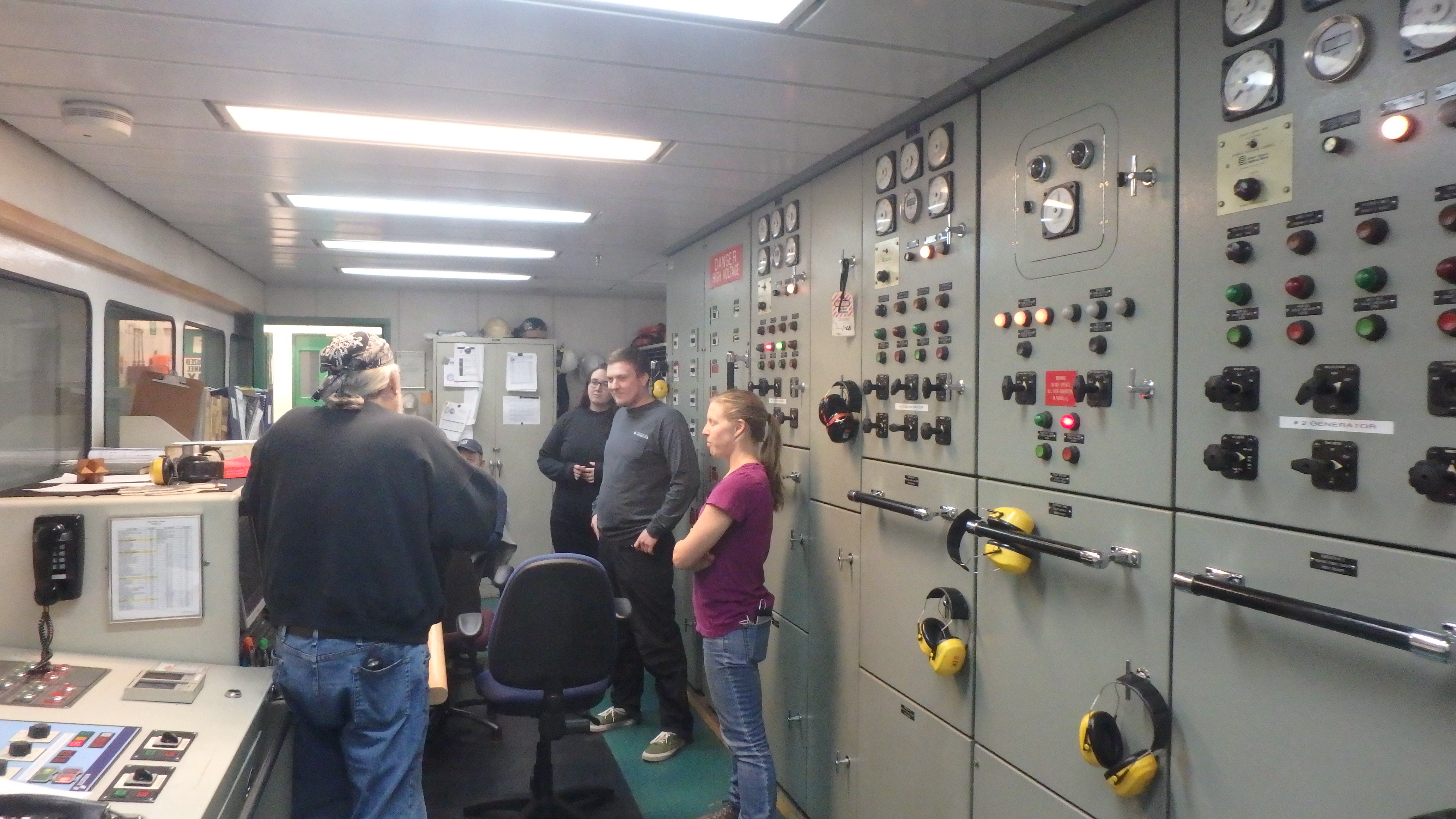 Cara Pekarcik: "Second engineer Richard Johnson goes over the engine room tour in the main control room. Because of the noise of the engine and the need for ear protection, Richard does not talk during the actual tour." Aboard the Nathaniel B. Palmer in the Drake Passage.