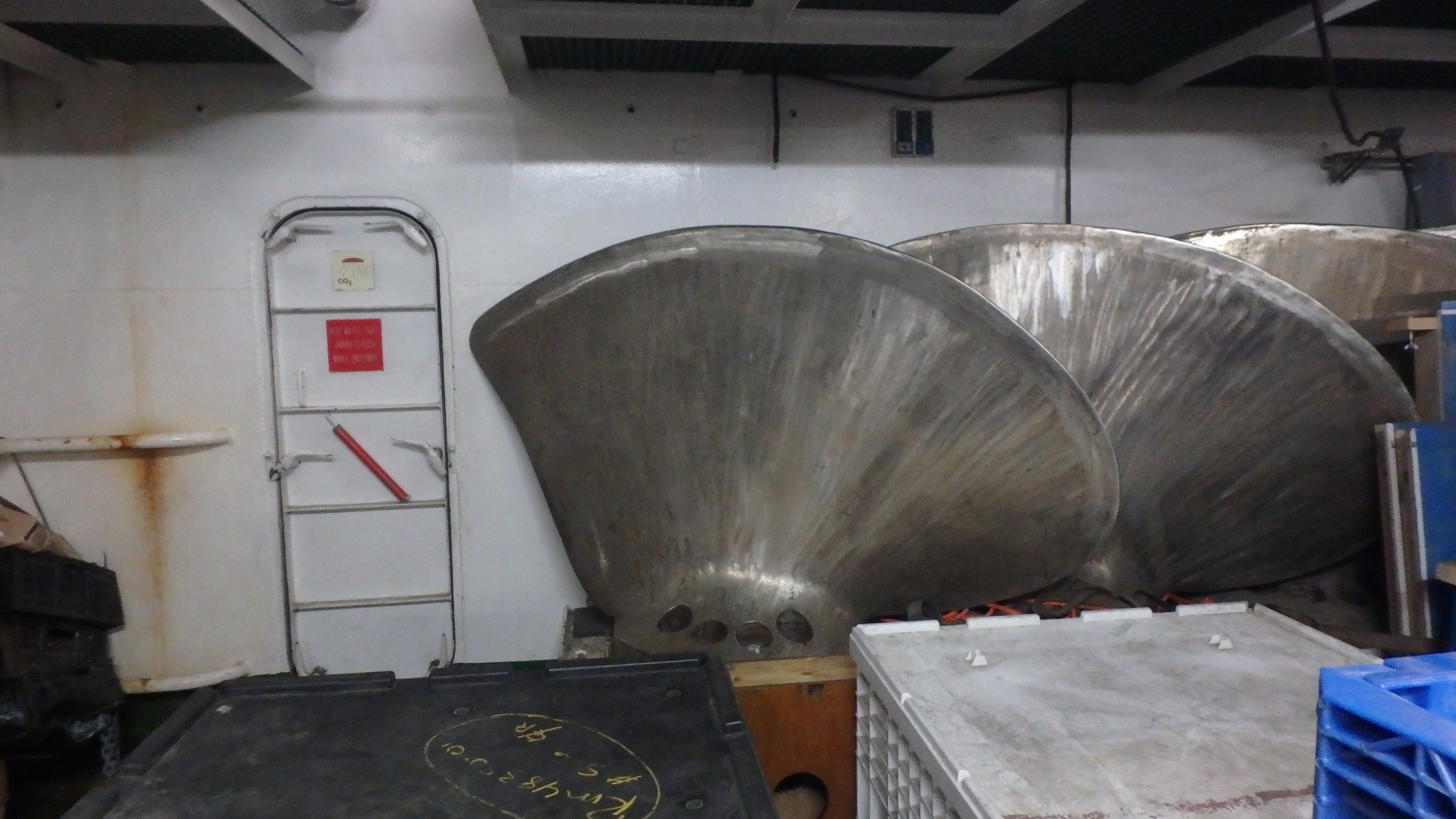 One of eight extra propeller blades that are stored in the main hold of the ship. Four blades are used for each propeller. When assembled, the propeller measures 13.12ft in diameter. Aboard the Nathaniel B. Palmer in the Drake Passage.