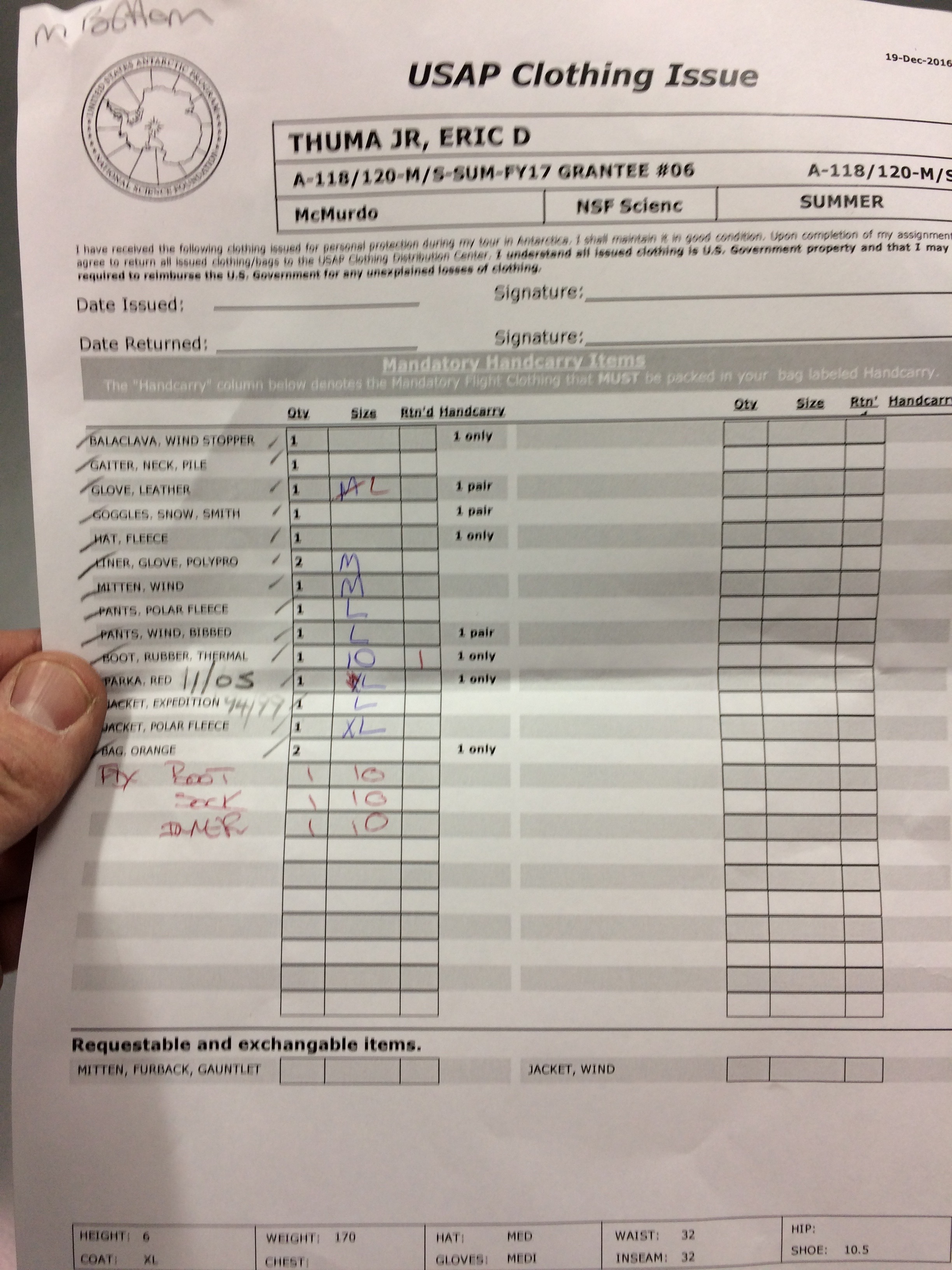 Documentation of Extreme Cold Weather (ECW) gear required for Eric Thuma. Christchurch, New Zealand.