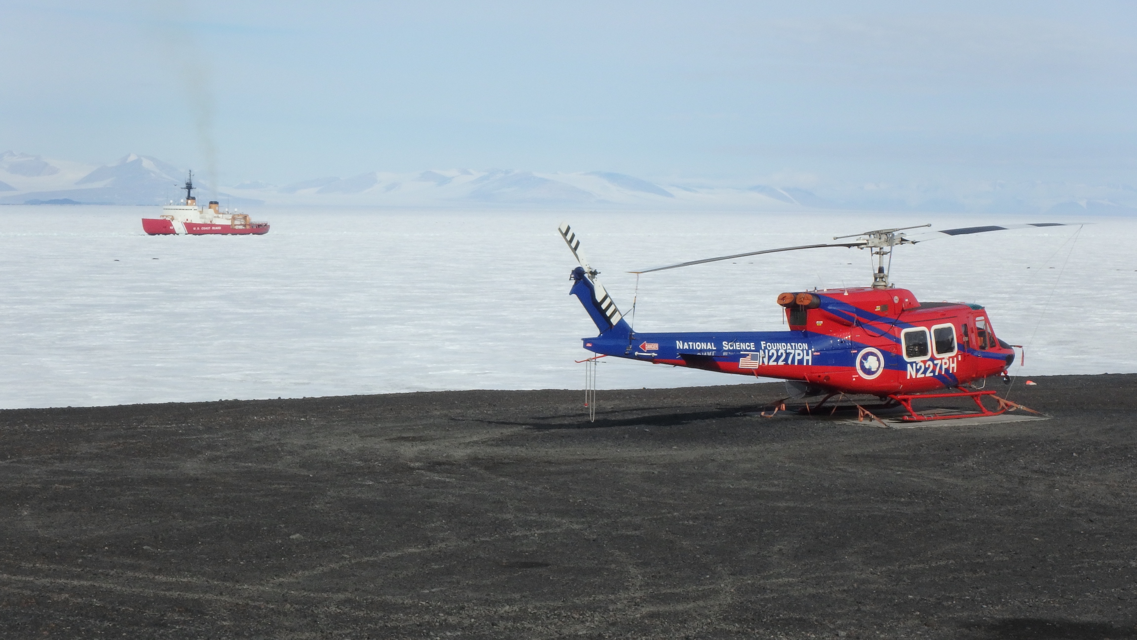 A helicopter with a U.S. Coast Guard icebreaker in the background at McMurdo Station, Antarctica.