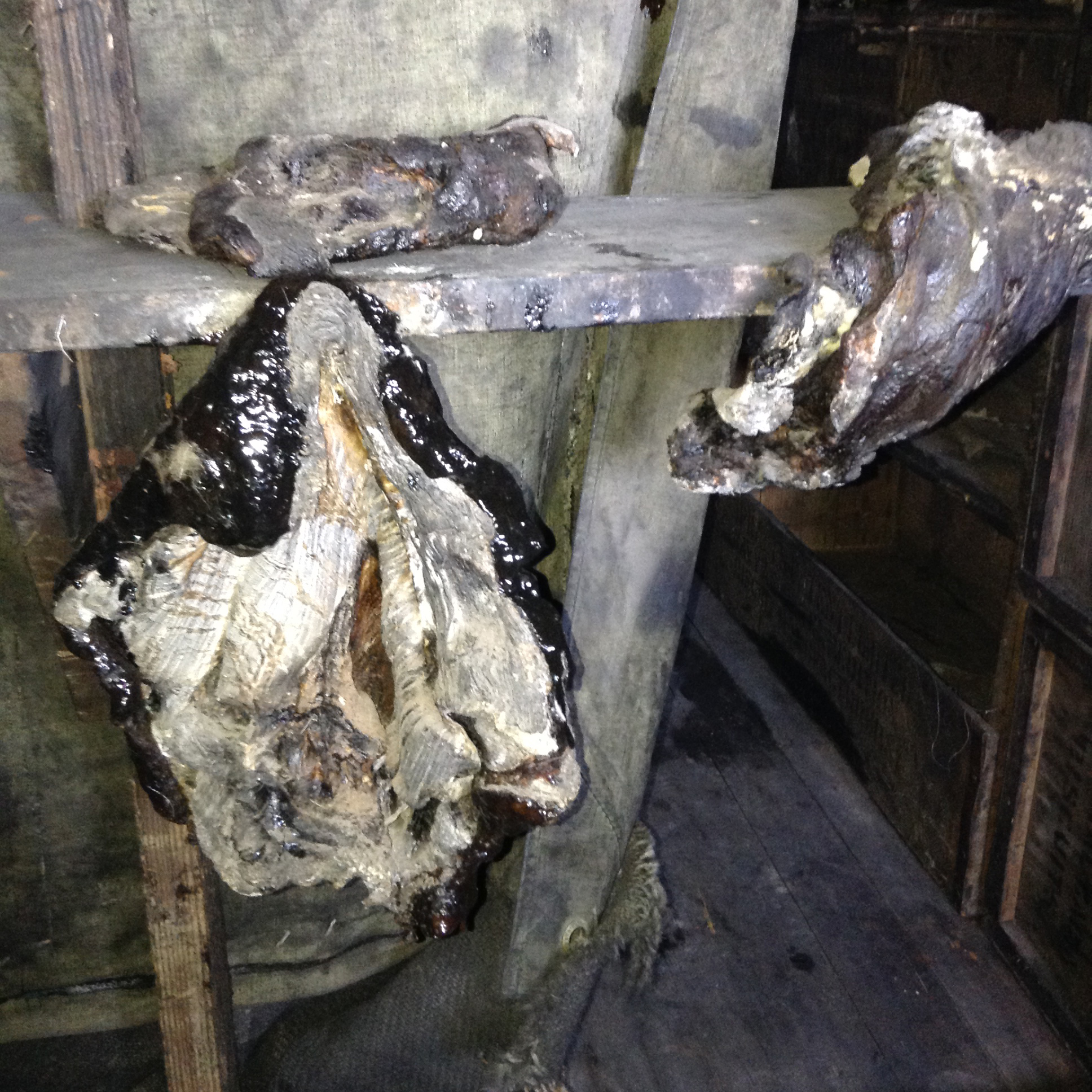 100 year old seal jerky hangs in the Discovery Hut. The Discovery Hut was built for Robert Falcon Scott's 1901–1904 Discovery Expedition. Near McMurdo Station, Antarctica.