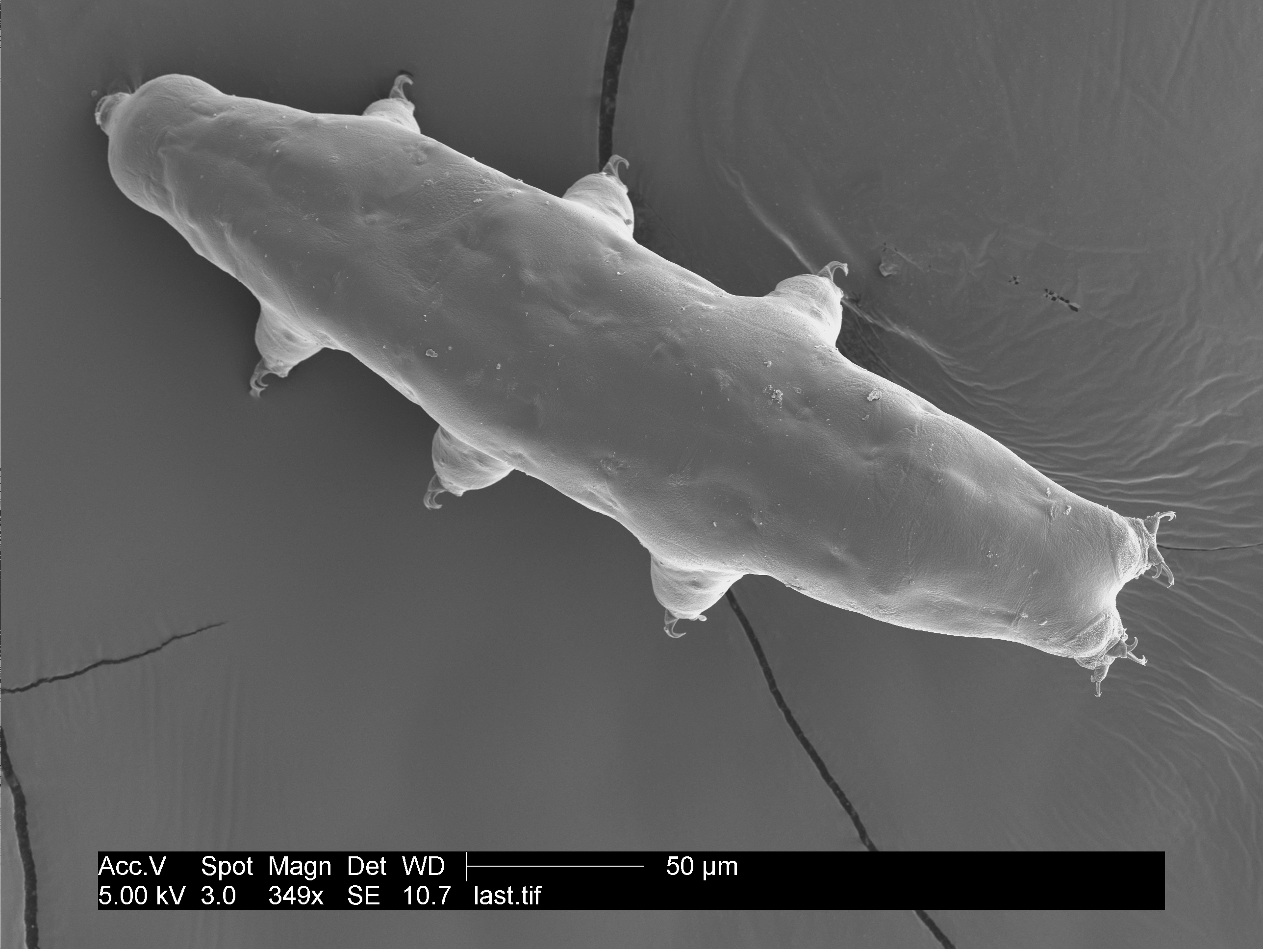 A Eutardigrade (Milnesiusm tardigradum) is pictured with its unarmored cuticle. The image was produced with a scanning electron microscope (SEM). In the Microscopy Lab at Brigham Young University in Provo, Utah.