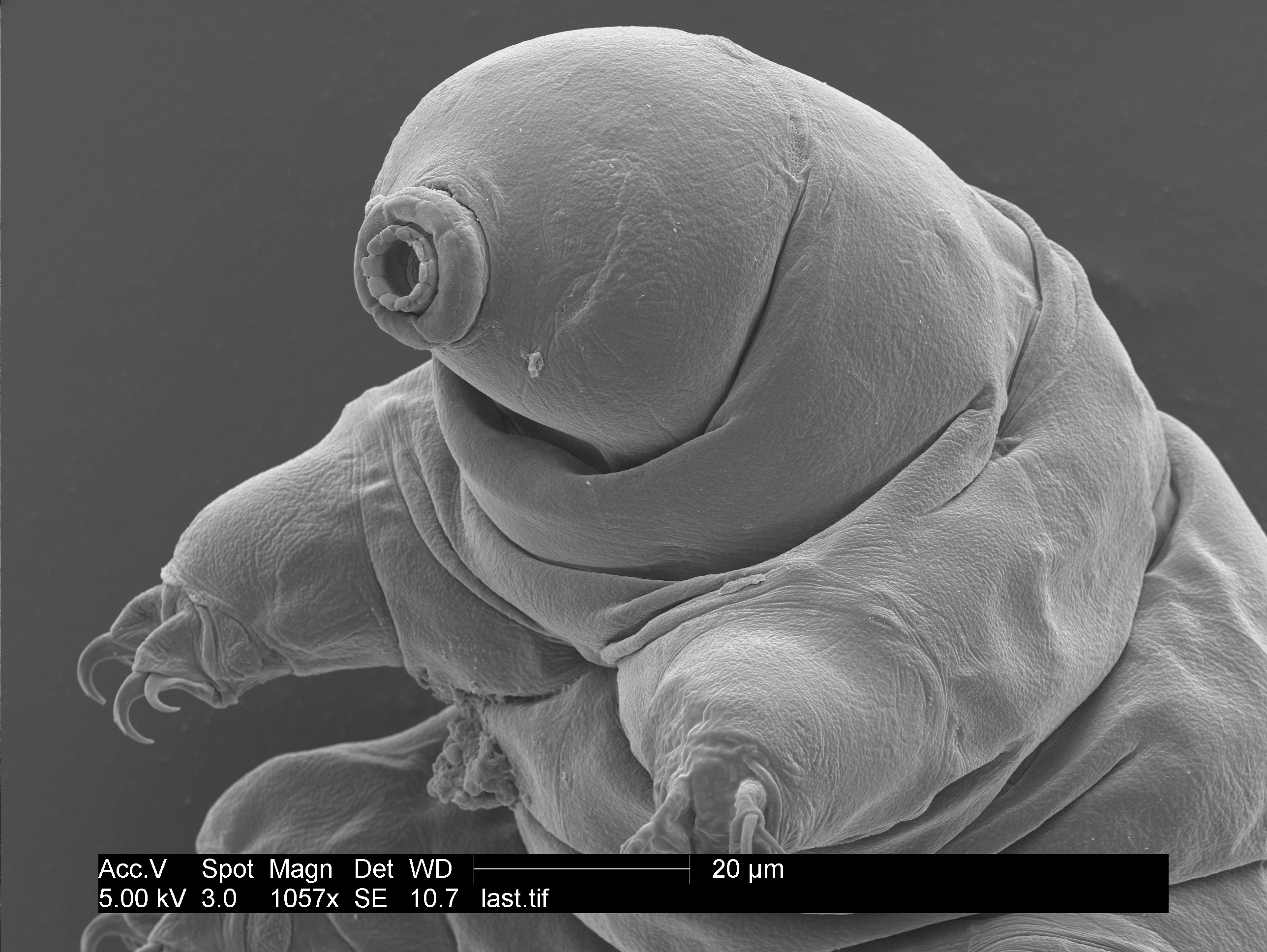 This scanning electron microscope (SEM) image shows a Eutardigrade (Macrobiotus spp.). Pictures from a SEM only show surface details. Specimens are prepared for SEM in a multi-step process that involves completely drying the animal and then coating it in gold before images can be taken. In the Microscopy Lab at Brigham Young University in Provo, Utah.