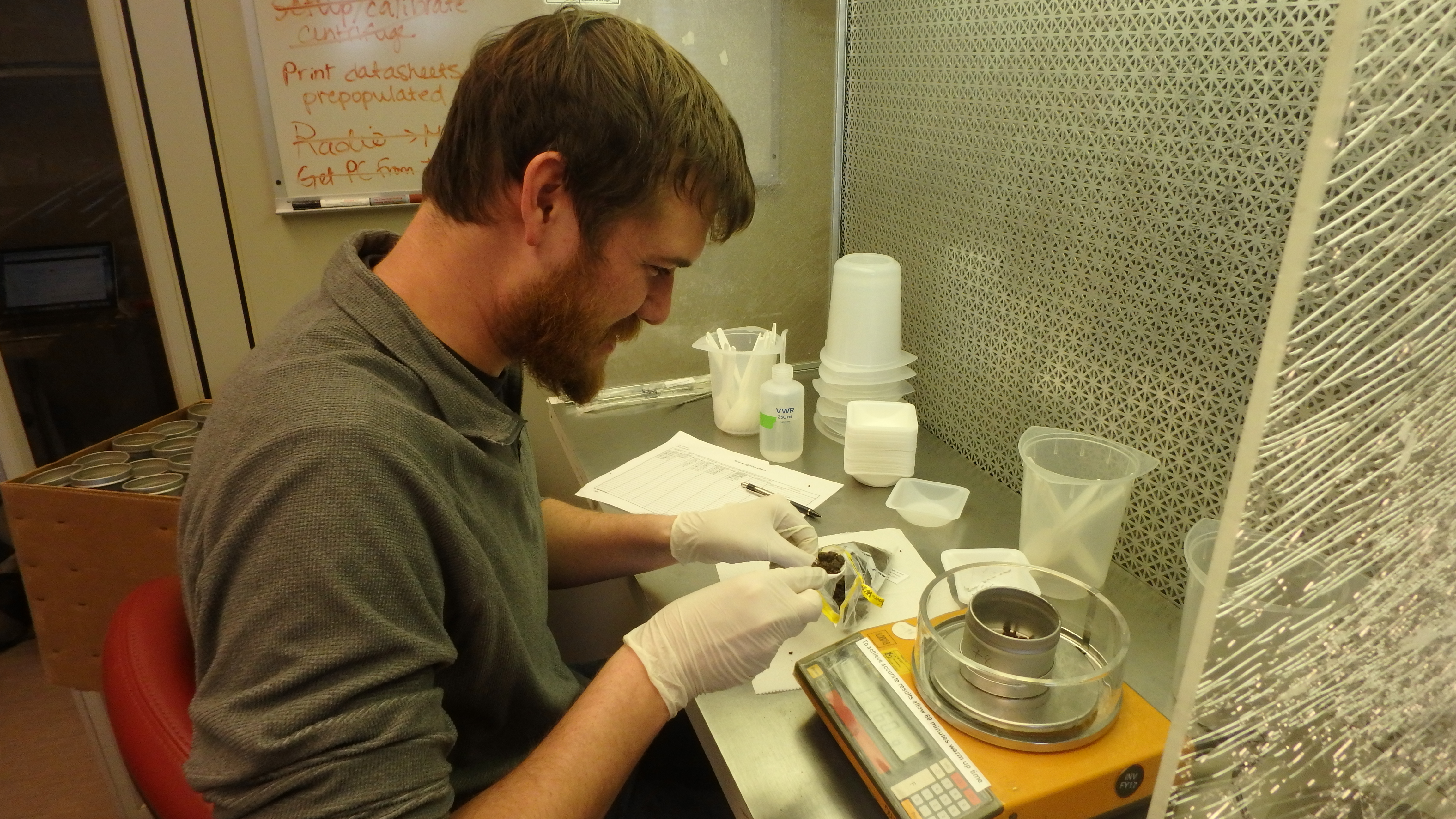 Matt Hedin separates a soil sample into three parts for separate tests: soil moisture, soil organisms, and an archived portion for future research. At the Crary Lab, McMurdo Station, Antarctica.