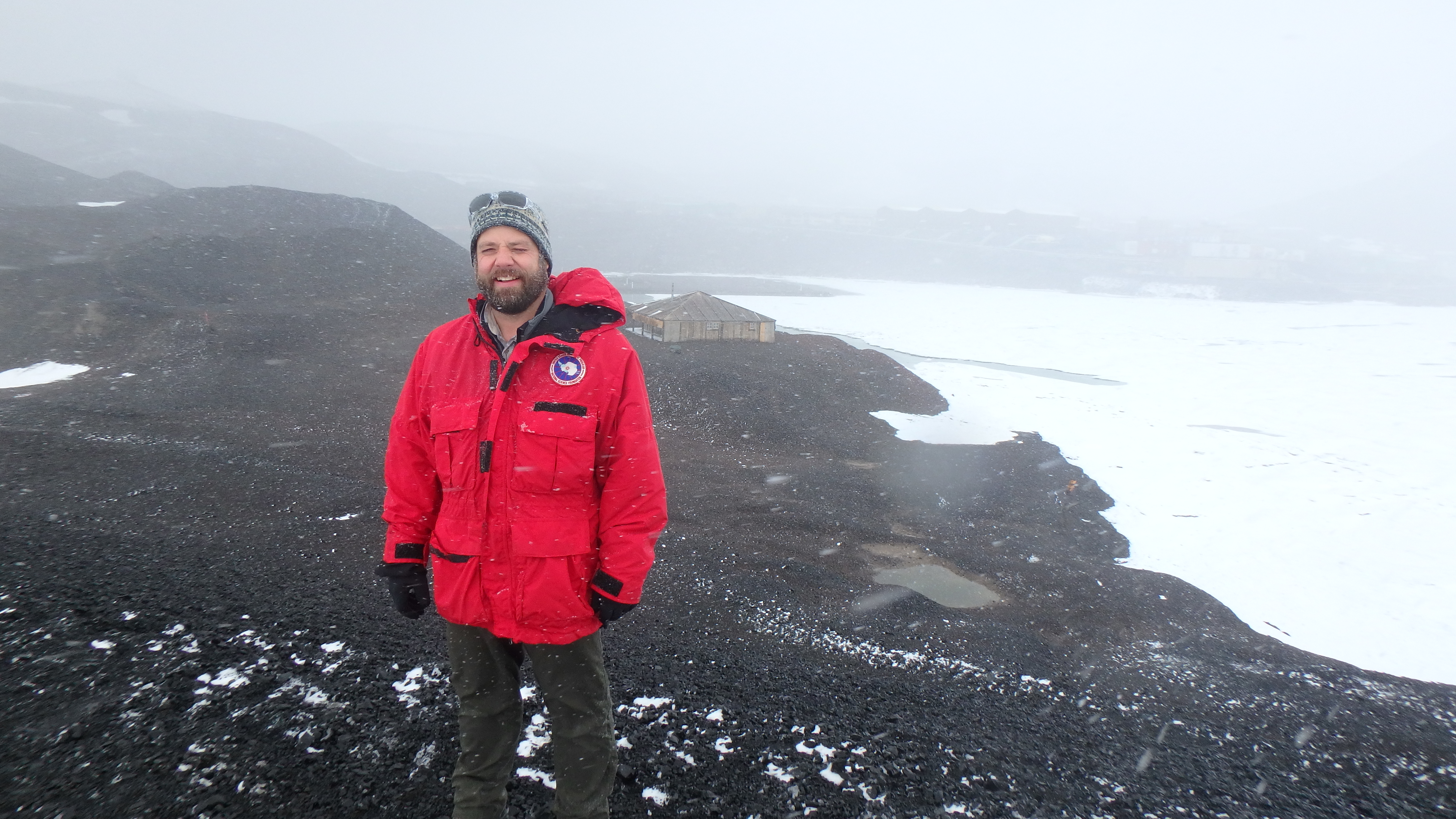 Josh Heward stands at Discovery Point with Discovery Hut in the background. The Discovery Hut was built for Robert Falcon Scott's 1901–1904 Discovery Expedition. McMurdo Station, Antarctica.