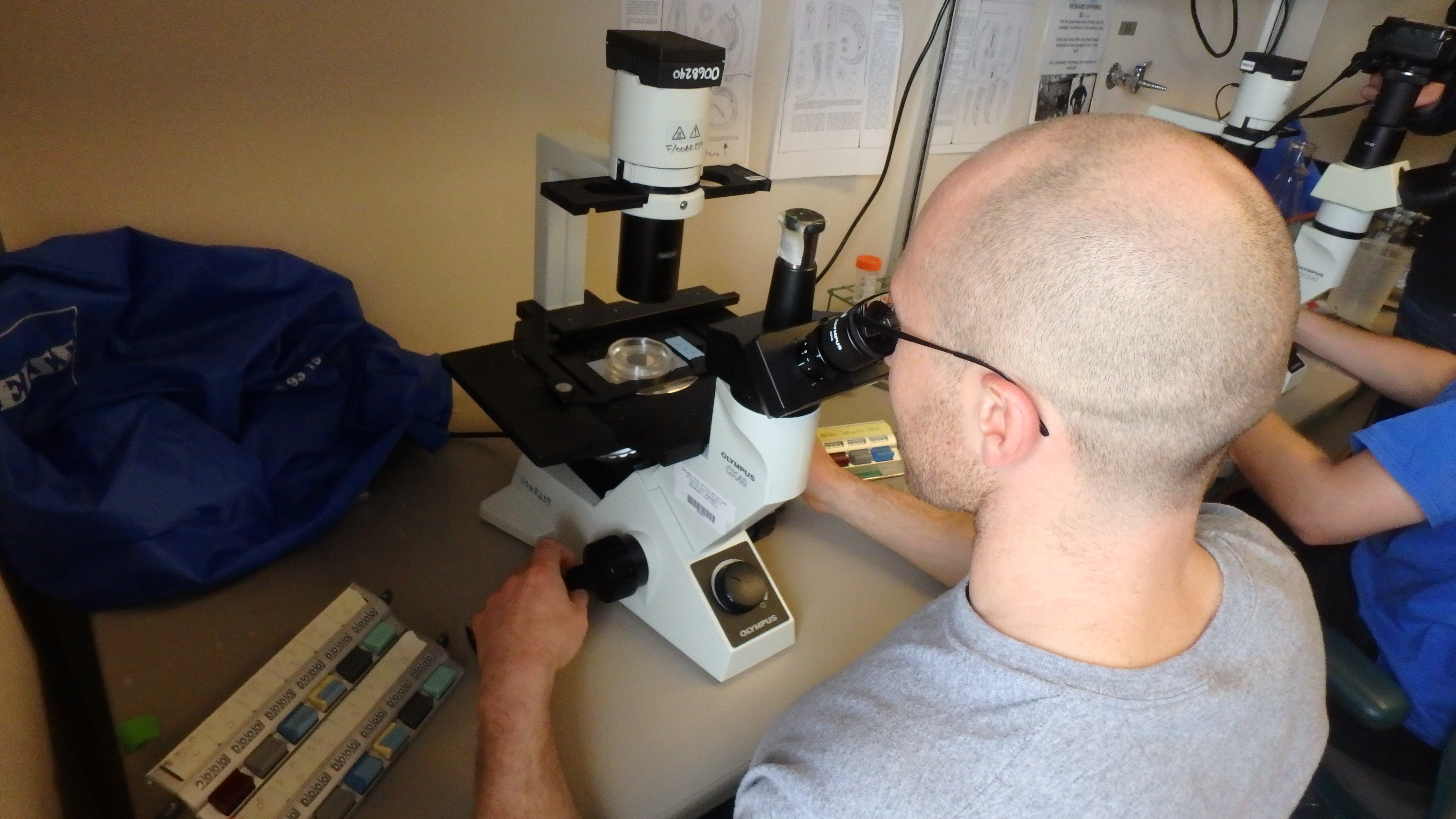 Walter Andriuzzi counts animals extracted from an Antarctic soil sample. Tally recorders are placed next to the microscope to record species, sex, and age class of each animal. At the Crary Lab, McMurdo Station, Antarctica.